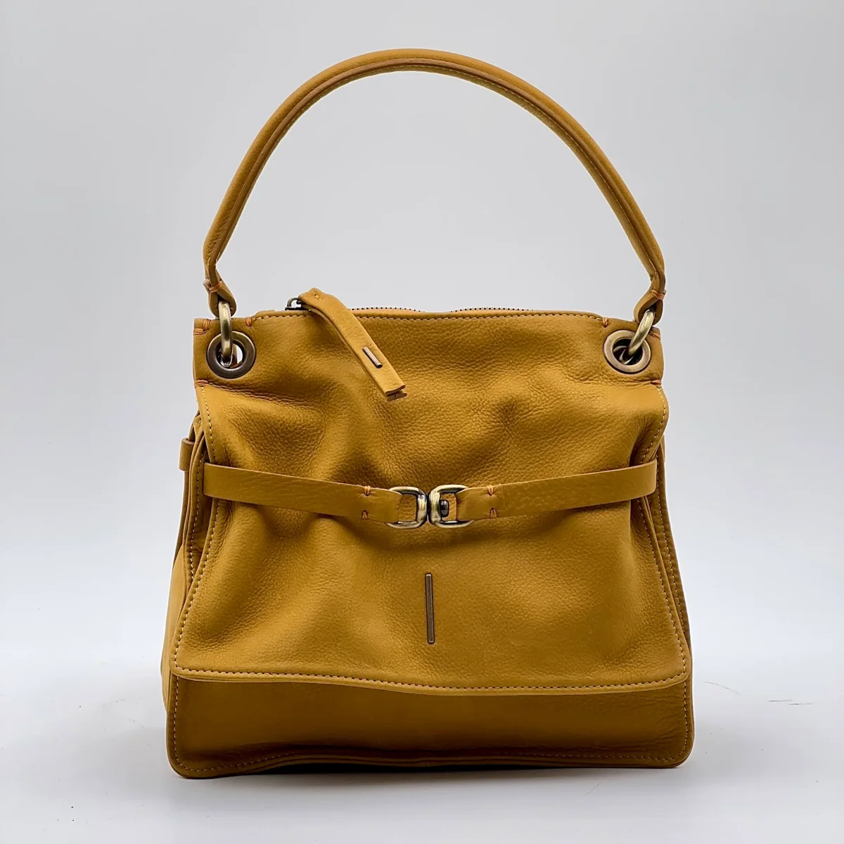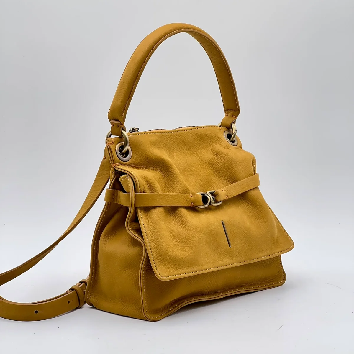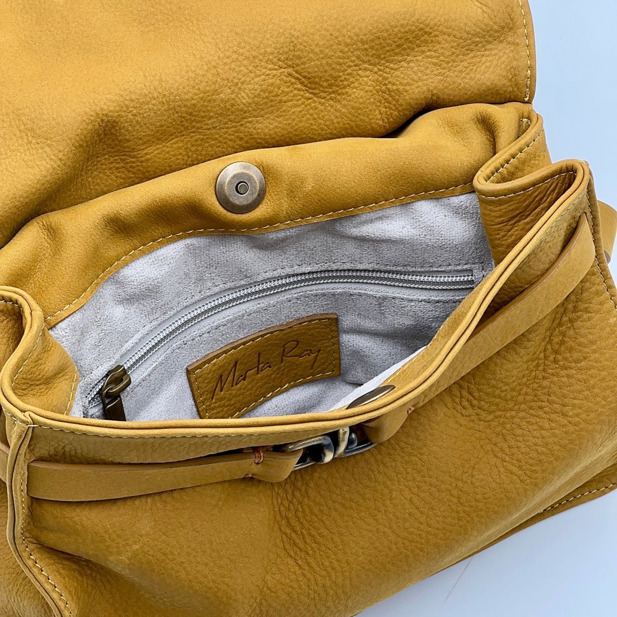Borsa compatta e strutturata in pelle effetto nabucato Long Beach color giallo mostarda, che noi chiamiamo ambra. Linee morbide, patta doppiata con chiusura magnetica e profili rimboccati per un’eleganza essenziale.