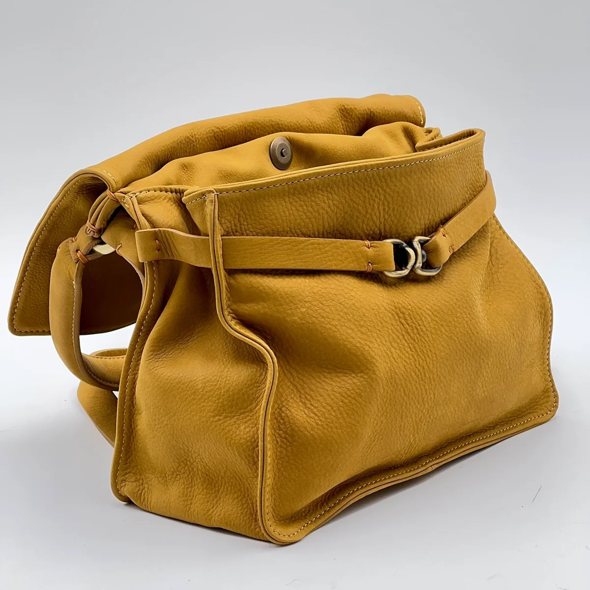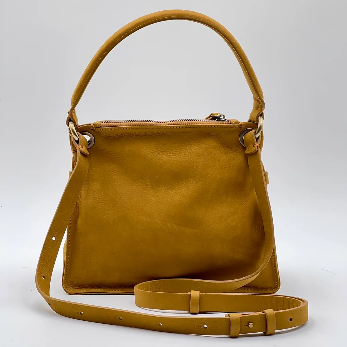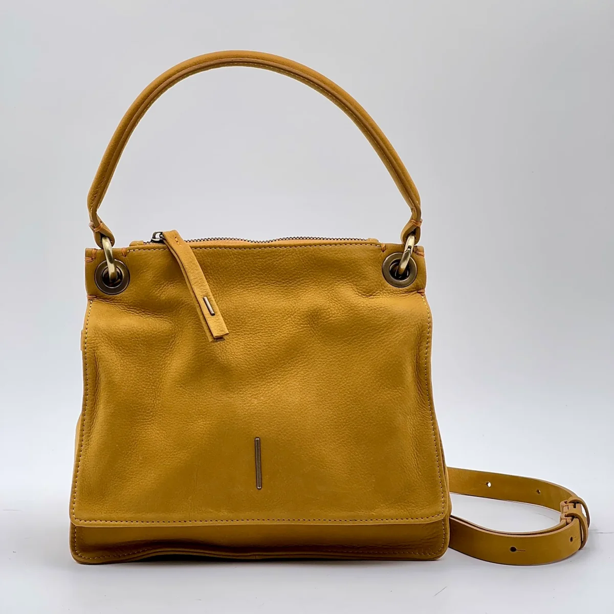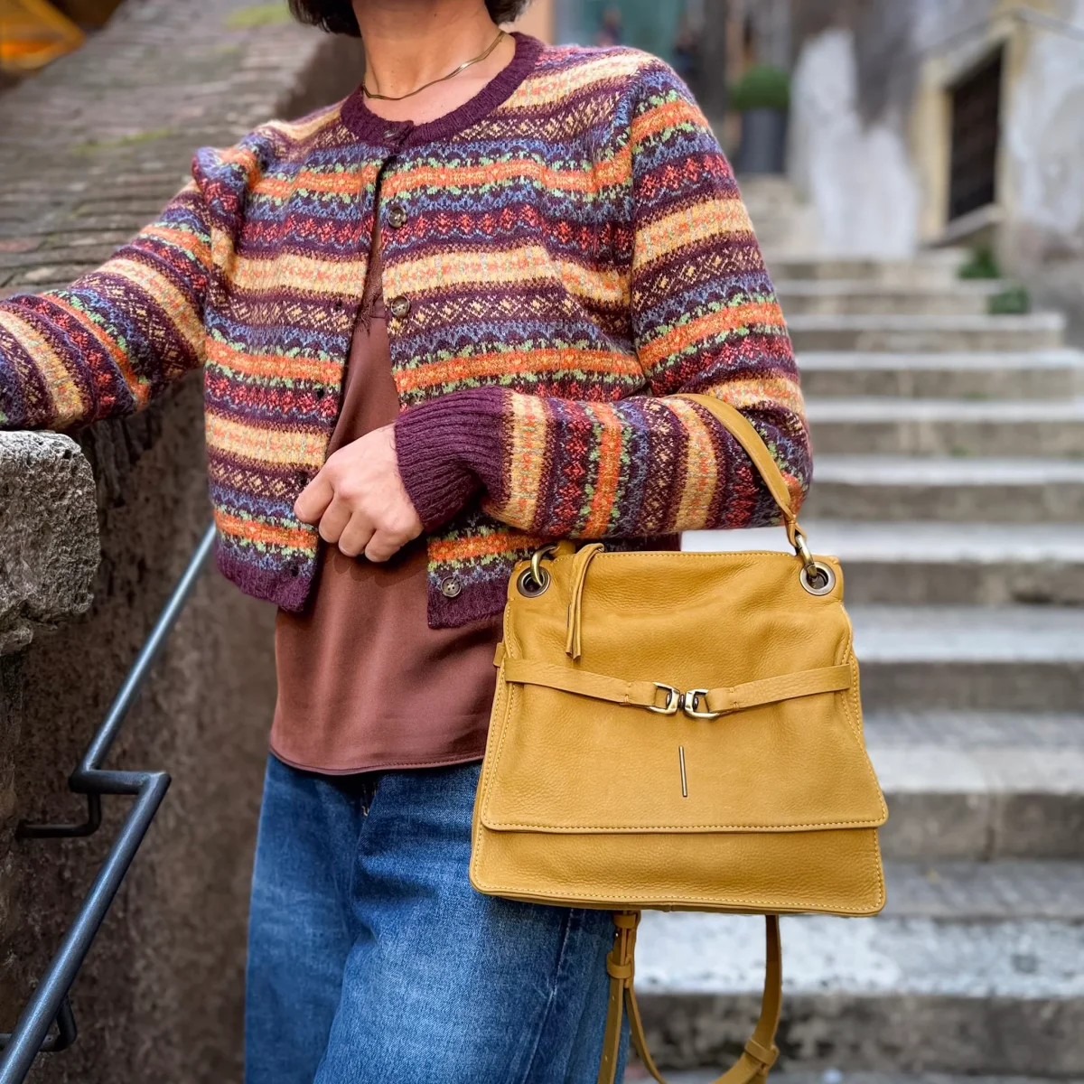 Borsa compatta e strutturata in pelle effetto nabucato Long Beach color giallo mostarda, che noi chiamiamo ambra. Linee morbide, patta doppiata con chiusura magnetica e profili rimboccati per un’eleganza essenziale.