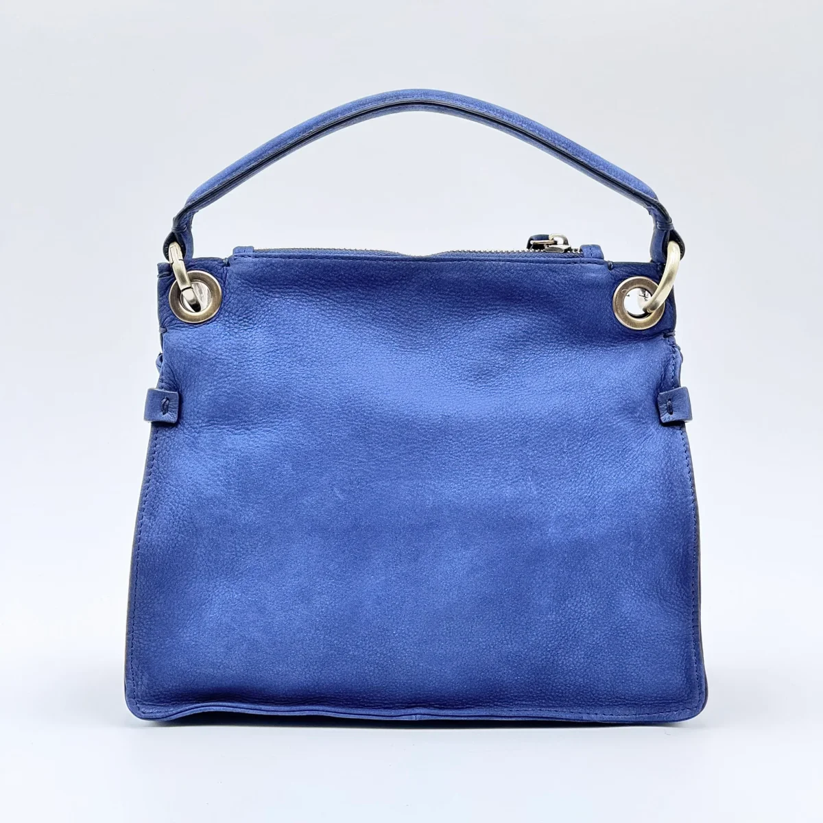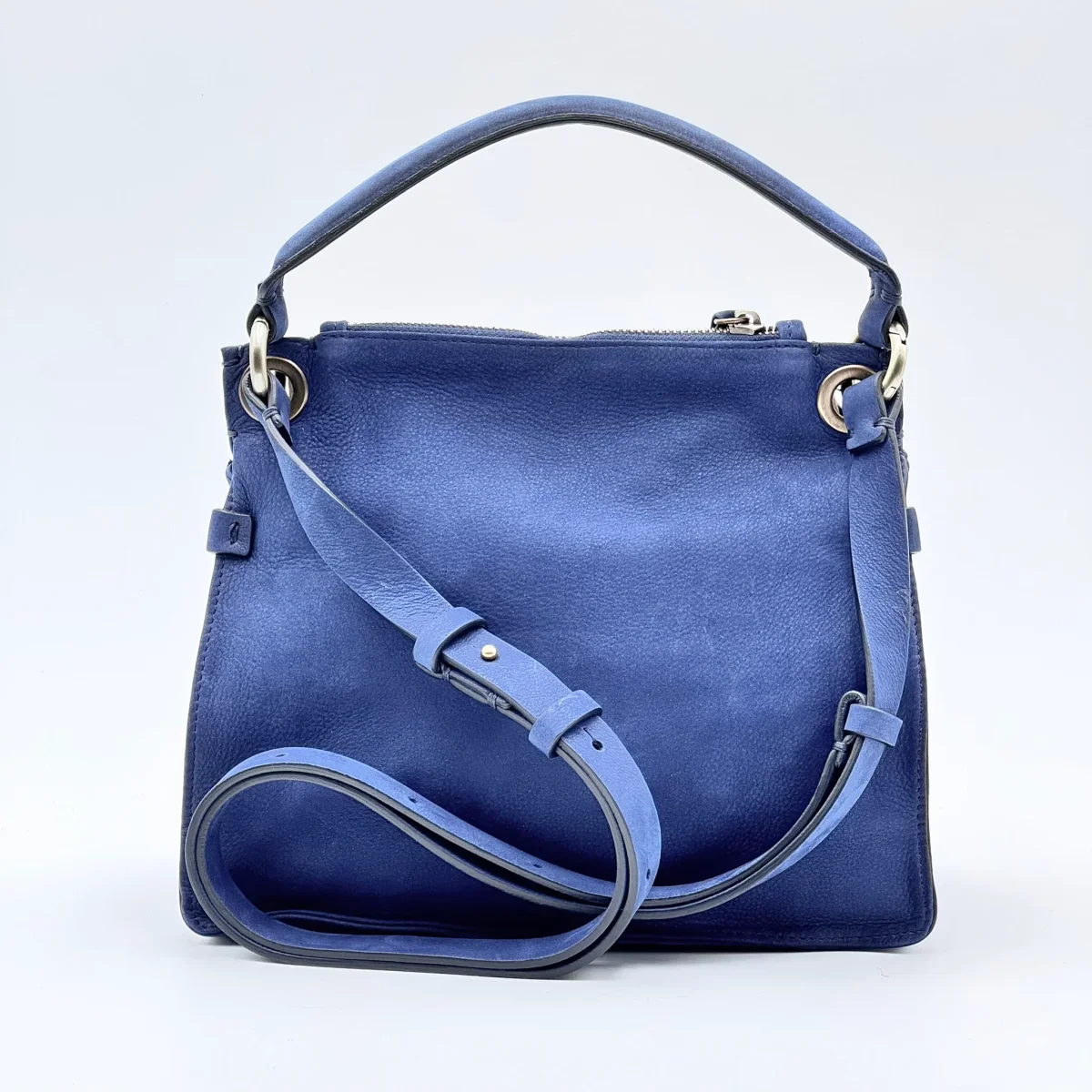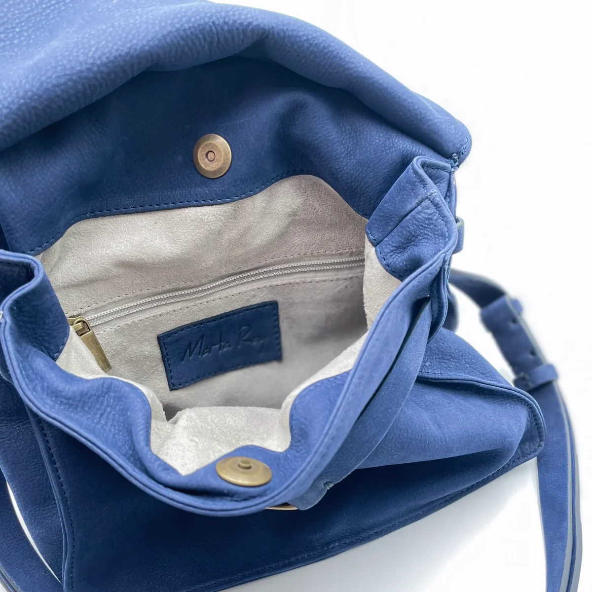 Borsa compatta e strutturata in pelle effetto nabucato Long Beach color nautica, un blu profondo e raffinato. Linee morbide, patta doppiata con chiusura magnetica e profili rimboccati per un’eleganza essenziale.