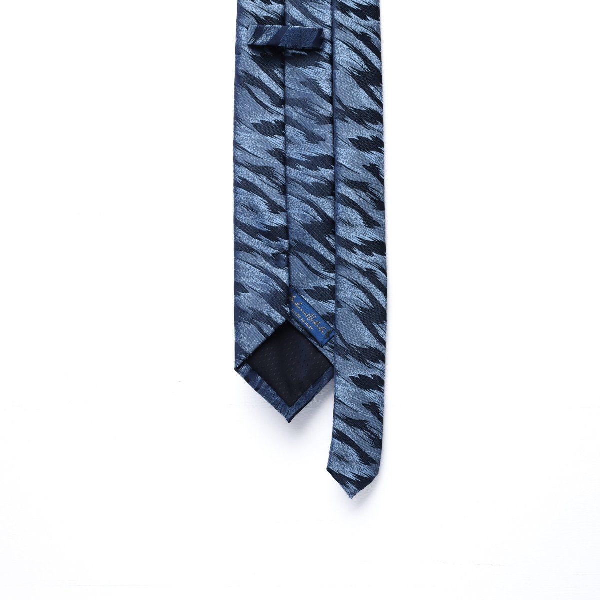 Cravatta artigianale Andrea Nobile realizzata in pura seta italiana con fantasia wild nei toni del azzurro e blu. La lavorazione del tessuto, dinamica e strutturata, esalta l’intensità della palette cromatica e conferisce carattere a ogni nodo. Modello a 3 pieghe, tagliato in singolo pezzo e rifinito con passante in tessuto coordinato e fodera interna.