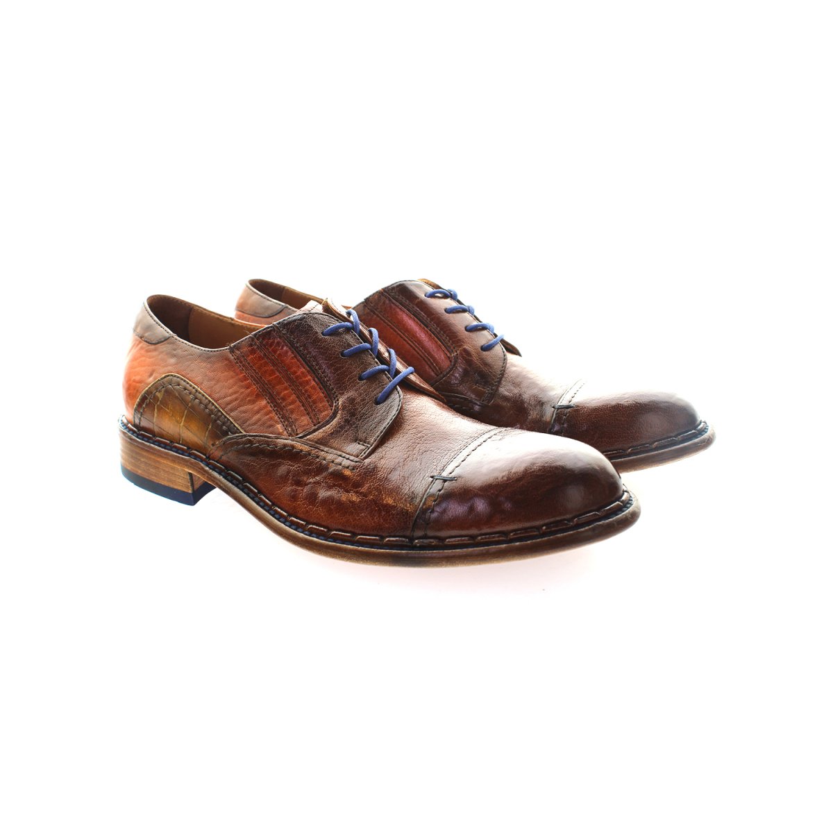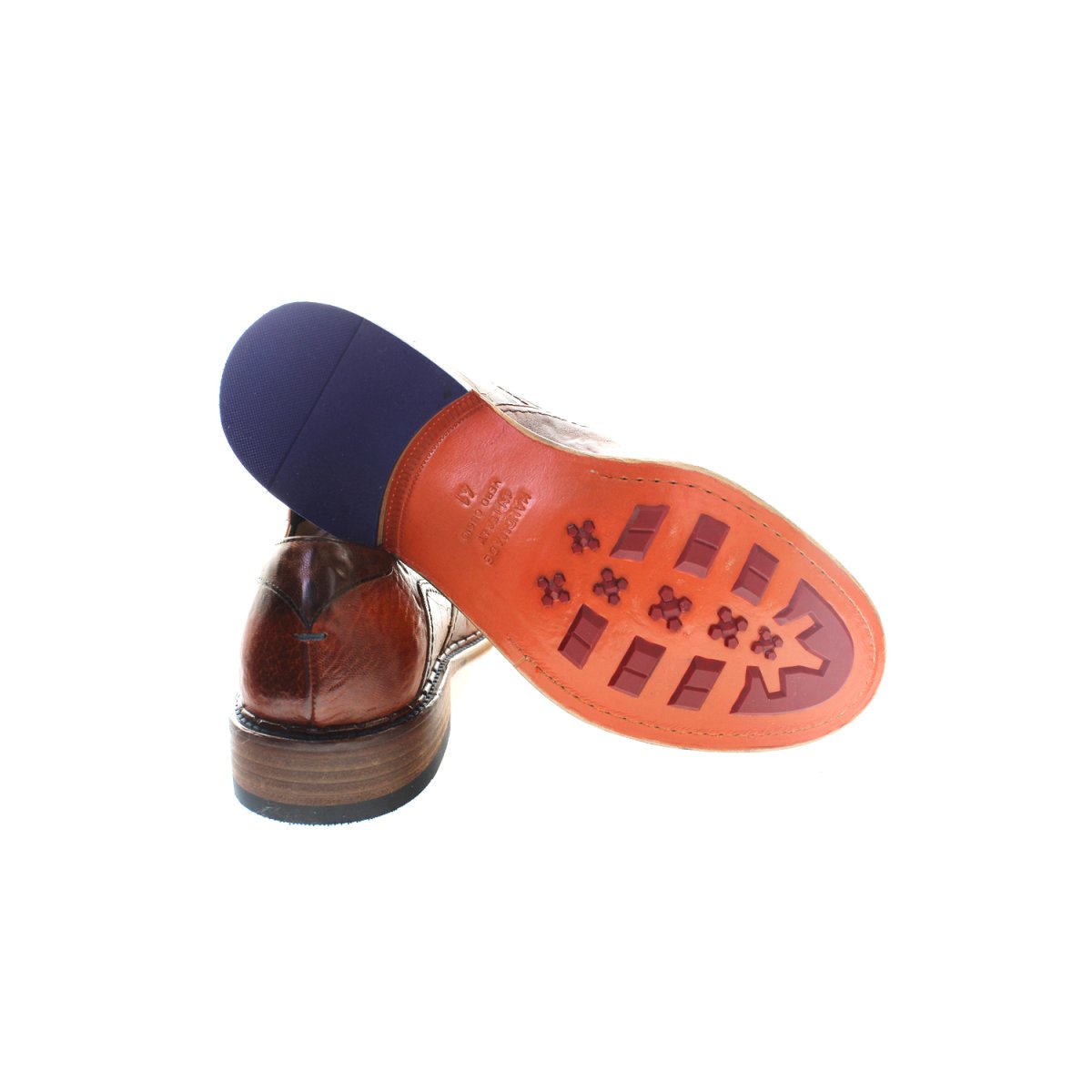 Oxford allacciata in pelle lavorata artigianalmente, ottima per chi vuole qualcosa di diverso ed unico rispetto alla classica oxford viste le varie lavorazioni sulla tomaia. La suola, interamente in cuoio, è in stile carrarmato e i tasselli sono in gomma. Questo tipo di suola conferisce una camminata agevole dato l’ottimo grip al terreno.