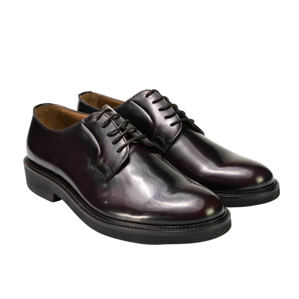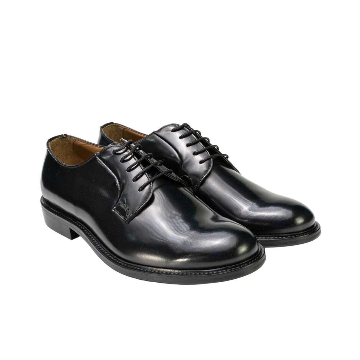 Derby stringata classica in pelle lucida che viene trattata e spazzolata a mano, scarpa molto elegante ideale per cerimonie, concerti classici e/o anche per eventi in cui è richiesto un look elegante senza dover rinunciare al comfort data la sua leggerezza dovuta alla suola interamente in gomma vibranium. Ha una calzata larga sulla pianta rendendo la calzatura ottimale anche per piedi più larghi. La suola è interamente in gomma antiscivolo