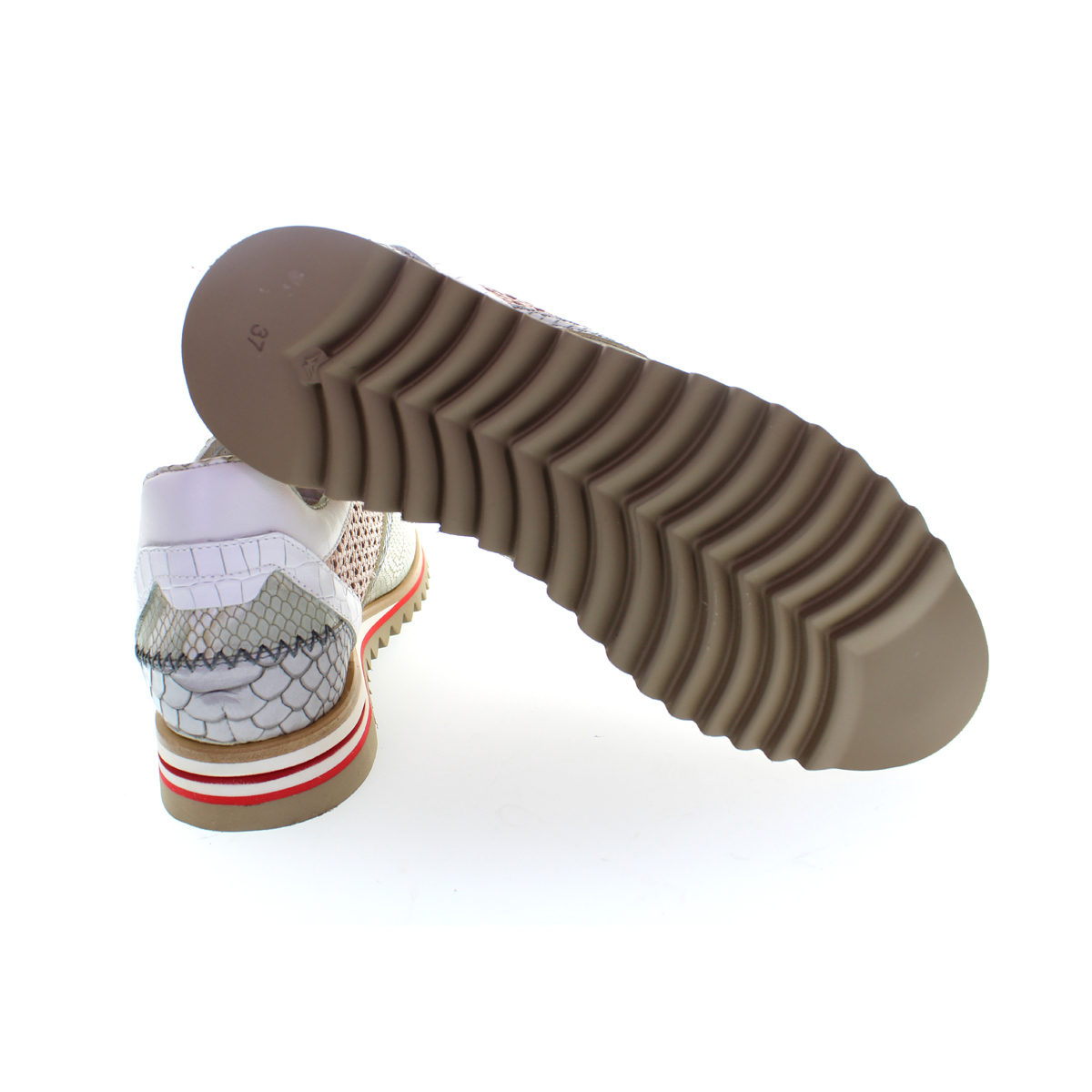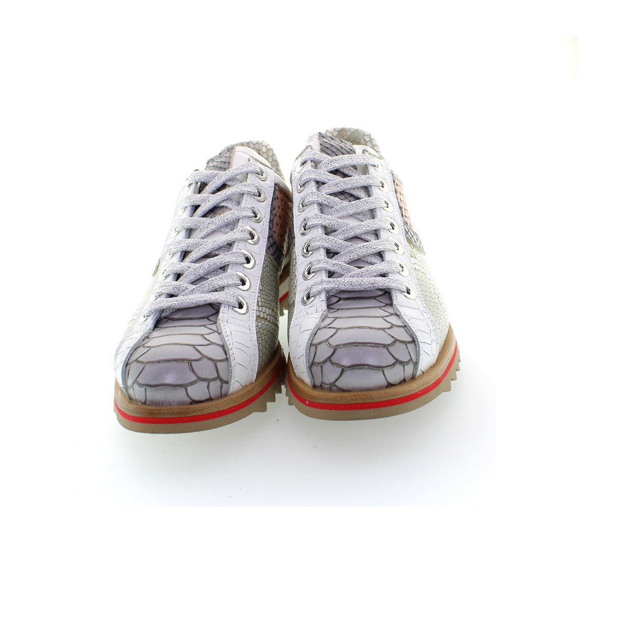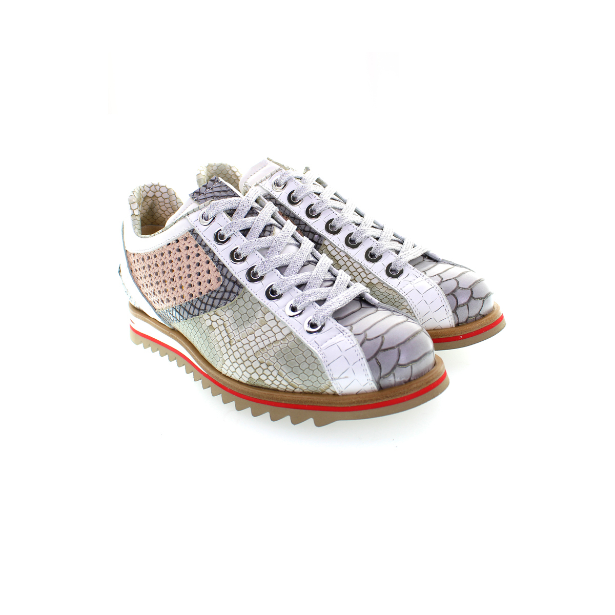 Sneakers artigianali da donna in pelle di vitellino con traforatura sulla tomaia, stile unico nel suo genere dato il mix di stampe di coccodrillo e pitone. Ideale per chi cerca una scarpa decisamente diversa e soprattutto comoda da usare durante il corso di tutta la giornata senza rinunciare alla qualità e allo stile dellartigianato italiano. La suola è interamente in gomma antiscivolo.