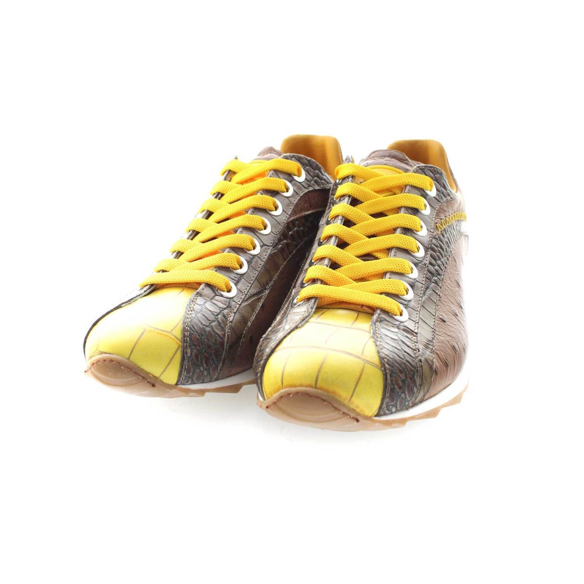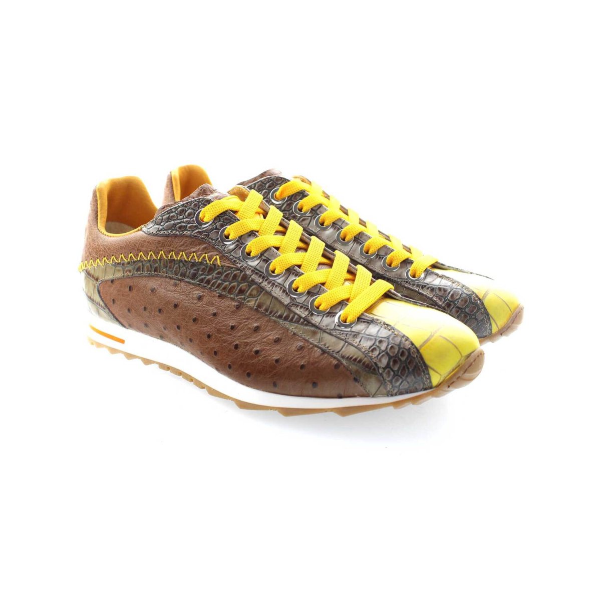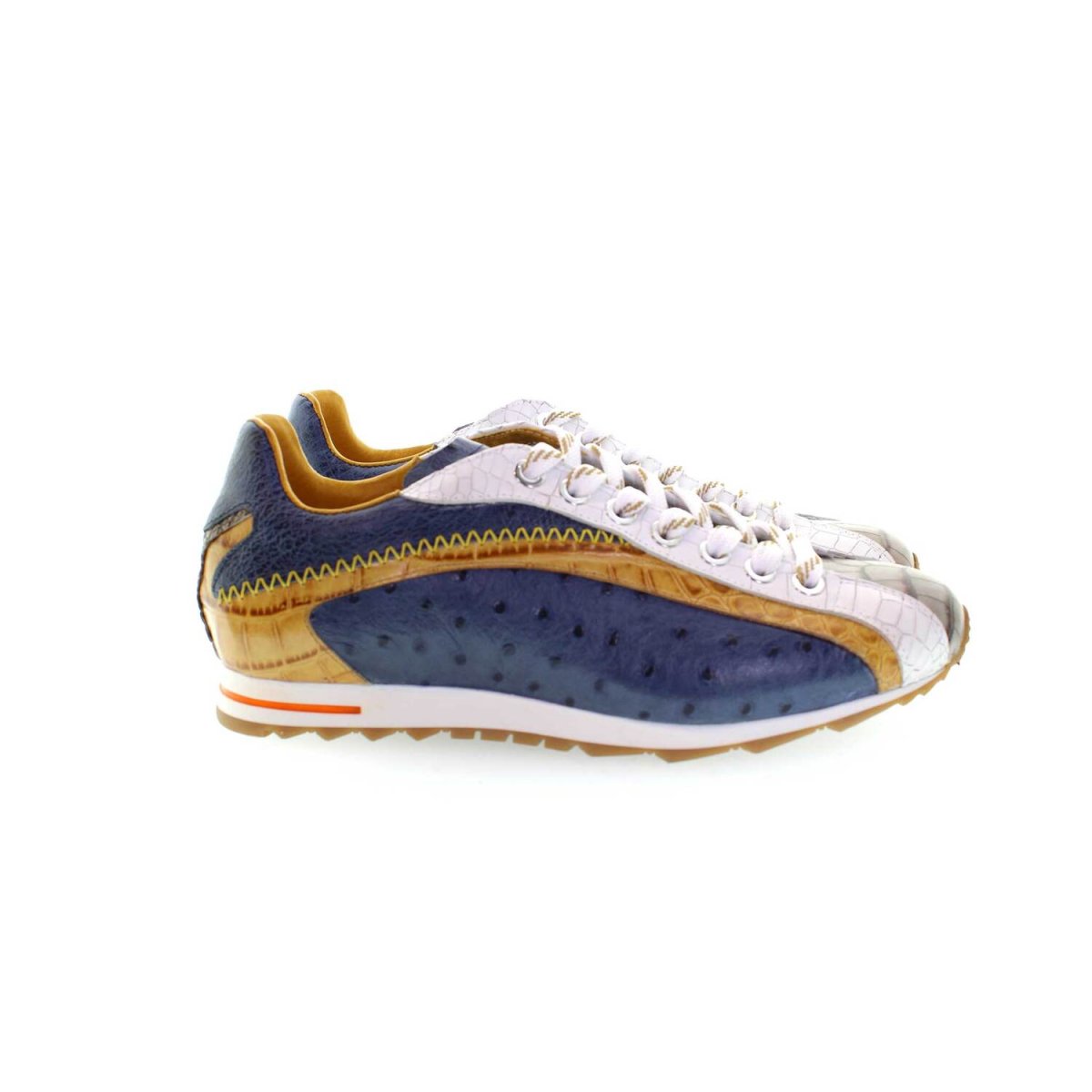 Sneakers artigianale realizzata in pelle di vitellino che viene trattata e colorata artigianalmente. Stampa coccodrillo e struzzo. Ideale per chi cerca una calzatura comoda e decisamente unica nel suo genere senza dover rinunciare all’elite dell’artigianato italiano. La suola è interamente in gomma antiscivolo ottima anche per ambienti sul bagnato.