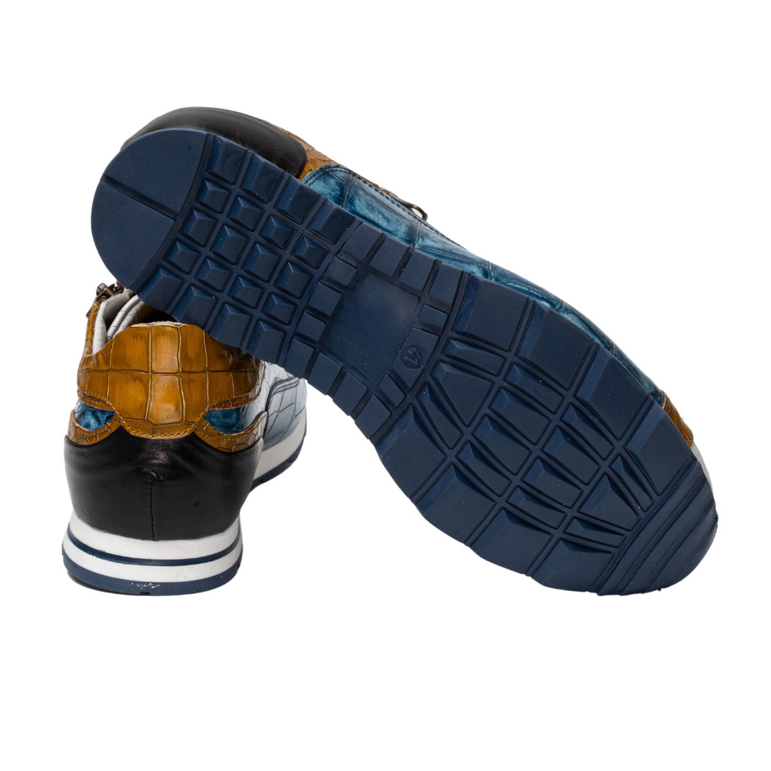 Sneakers artigianale da uomo in pelle di vitello con stampa coccodrillo. Presentata con una cerniera laterale funzionante che facilita l’indossabilità. La suola in gomma antiscivolo garantisce stabilità e rende la calzatura ideale su ambienti bagnati. Ideale per chi cerca una sneaker in pelle decisamente unica nel suo genere.