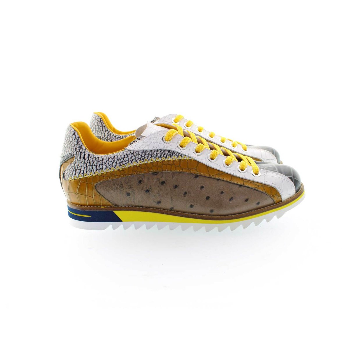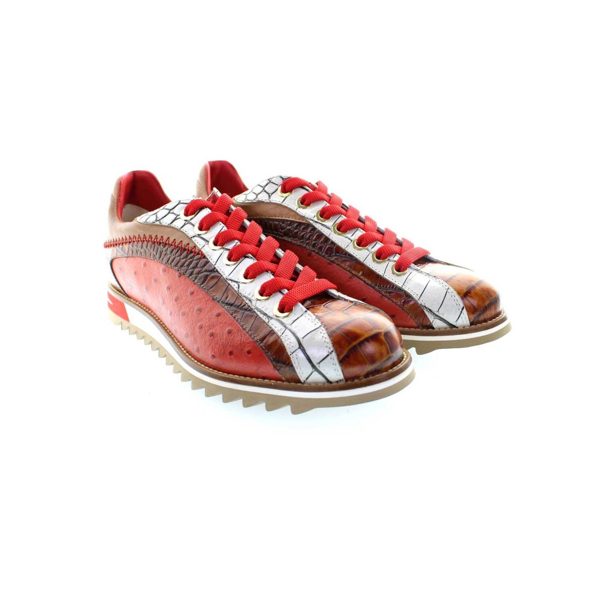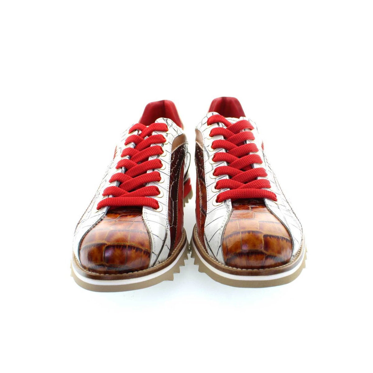 Sneakers artigianale realizzata in pelle di vitellino che viene trattata e colorata artigianalmente. Stampa coccodrillo e struzzo. Ideale per chi cerca una calzatura comoda e decisamente unica nel suo genere. La suola è interamente in gomma antiscivolo ottima anche per ambienti sul bagnato.
