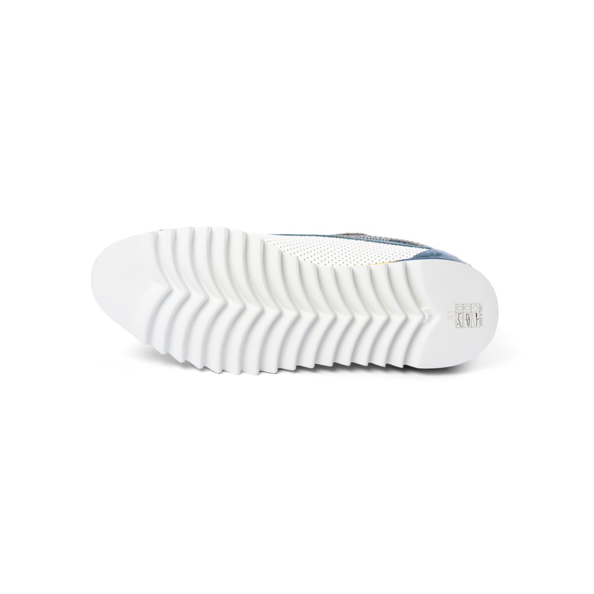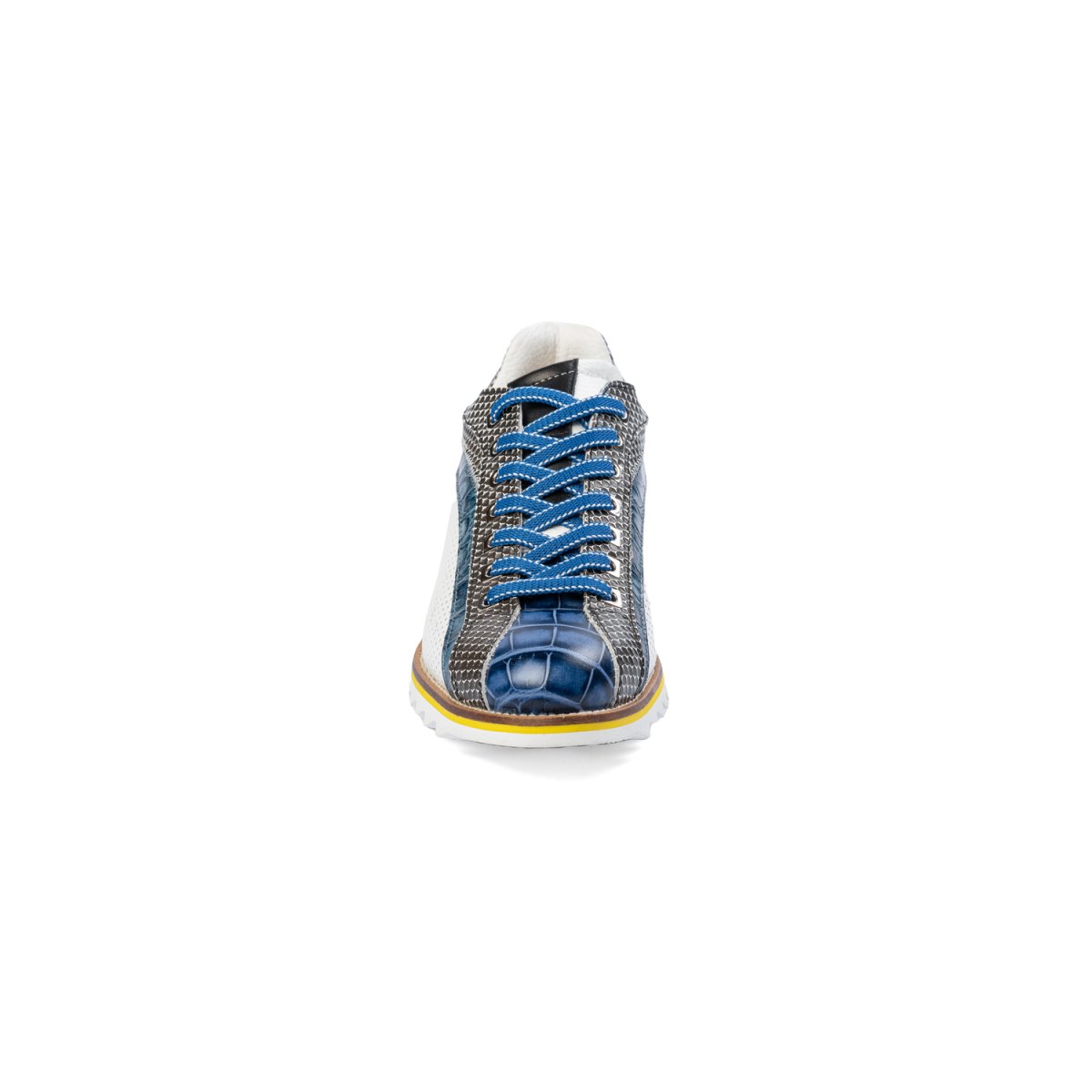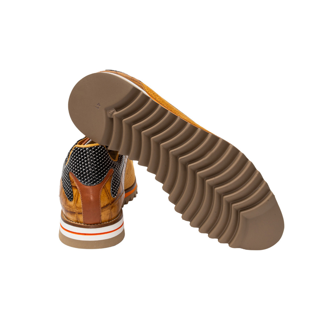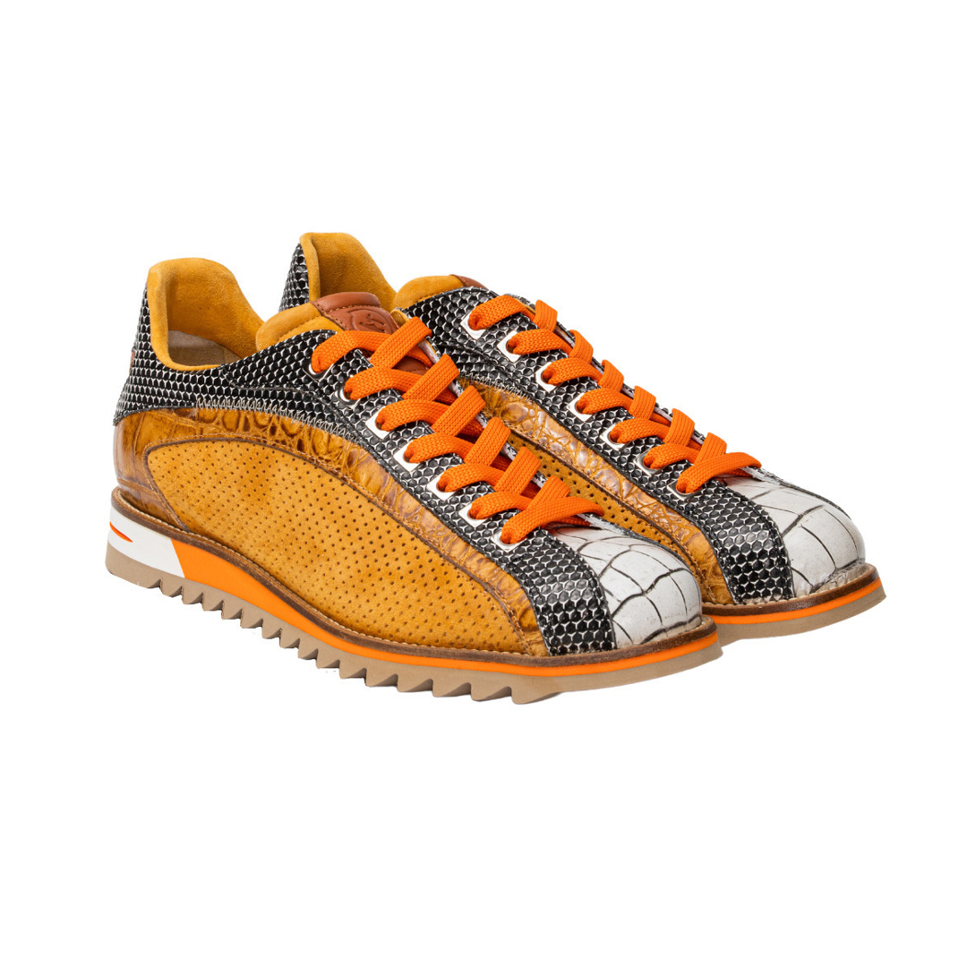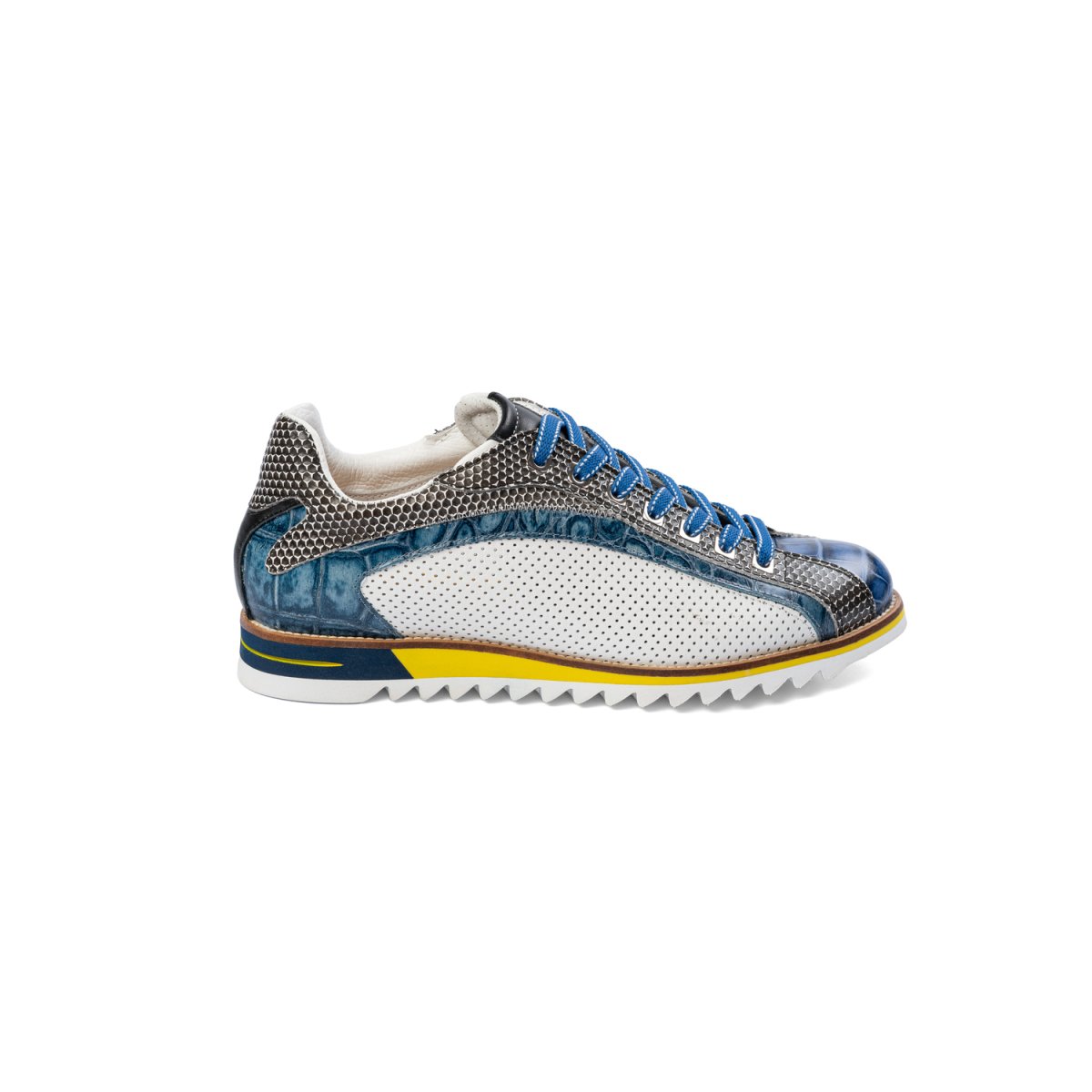 Sneakers artigianale realizzata in pelle di vitellino, la parte coccodrillo stampata, e in camoscio, la parte laterale, che vengono trattate e colorate artigianalmente. Texture microforata sulla tomaia ma essendo la calzatura foderata la si può utilizzare anche nei periodi di pioggia. La suola è interamente in gomma antiscivolo ottima anche per ambienti sul bagnato.