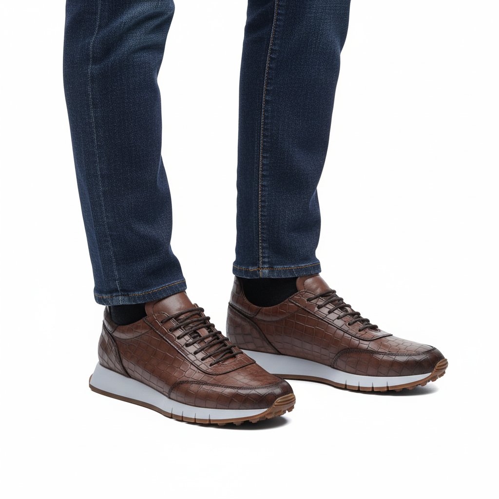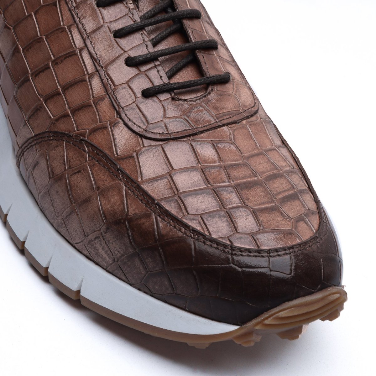 Sneaker Artigianale Made in Italy realizzata in vera pelle con stampa coccodrillo, tinta a mano nel colore taupe con sfumature naturali, dal design minimalista e raffinato.