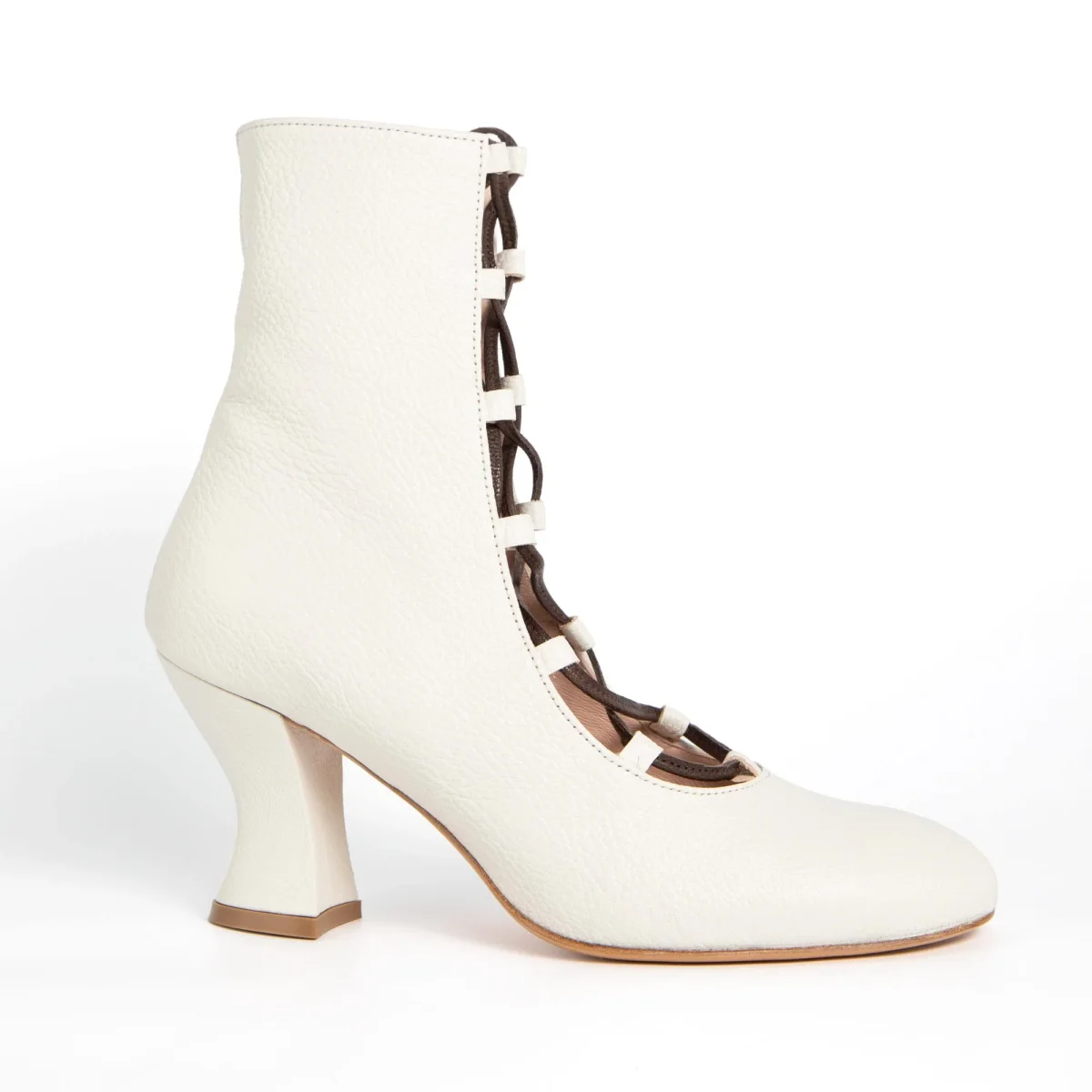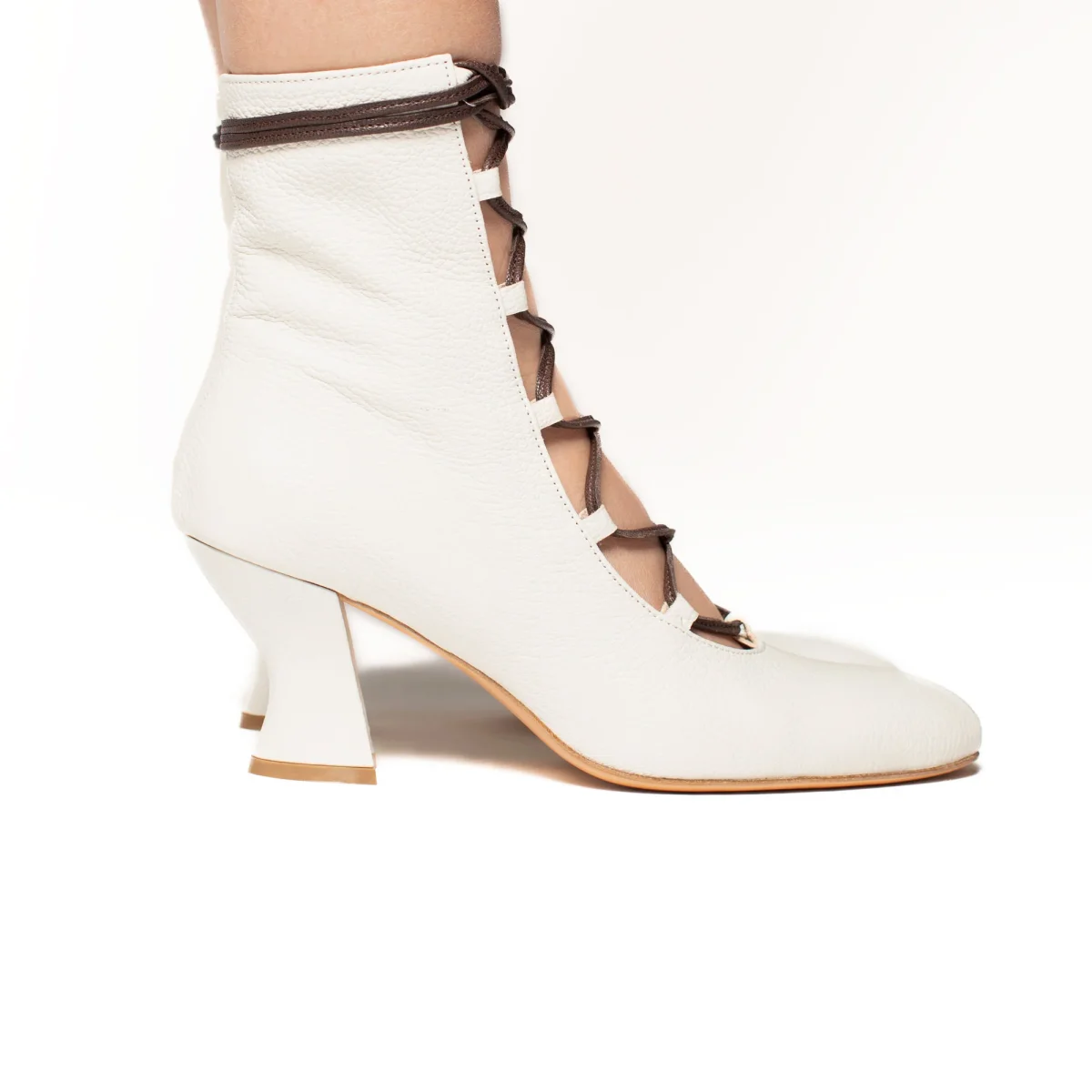 Tronchetto aperto davanti con allacciatura a vista. Tacco 7cm rivestito in pelle. Sottopiede in pelle e fondo in cuoio