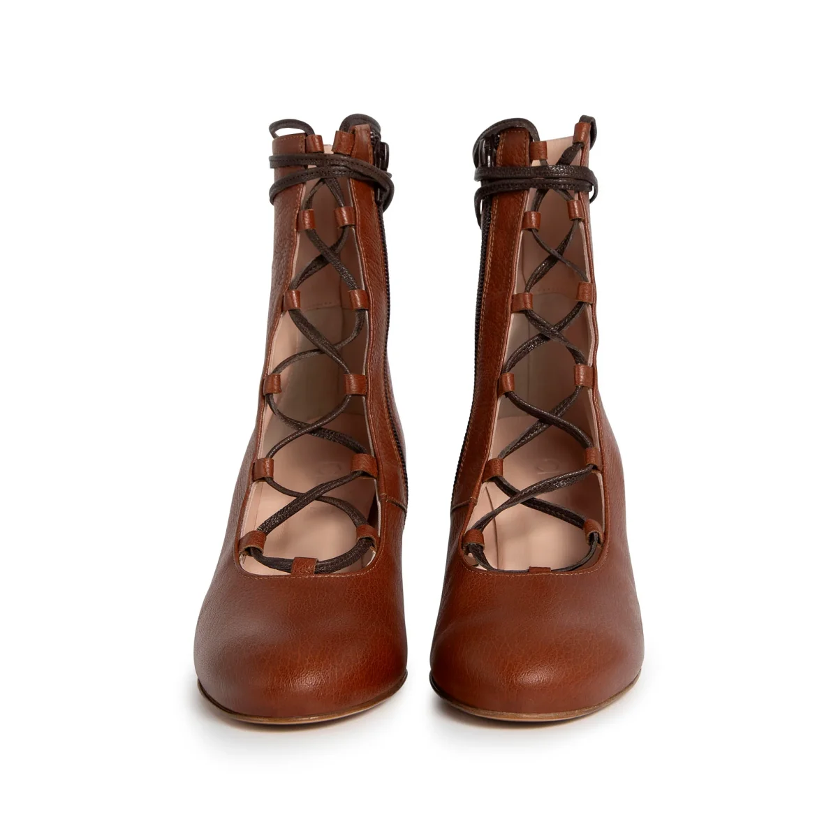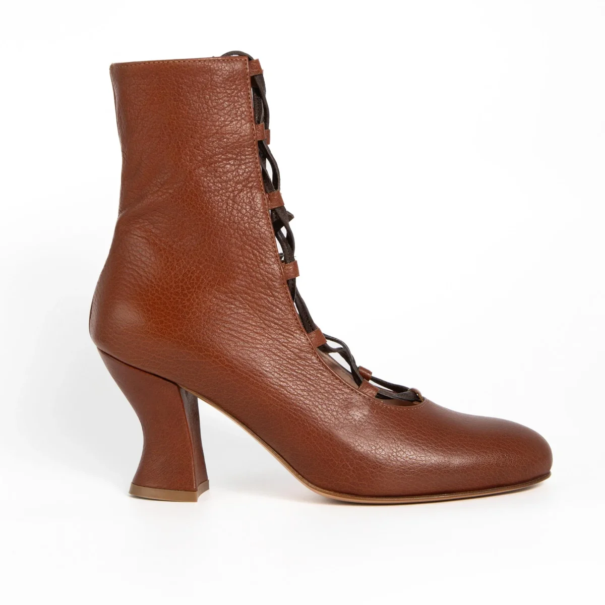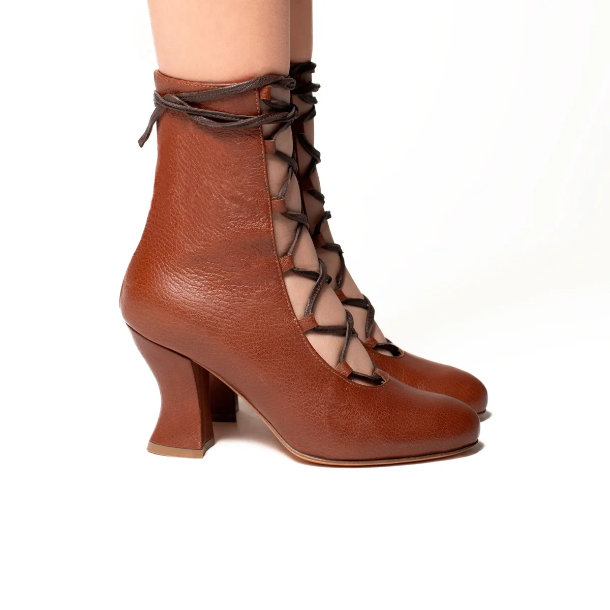 Tronchetto aperto davanti con allacciatura a vista. Tacco 7cm rivestito in pelle. Sottopiede in pelle e fondo in cuoio