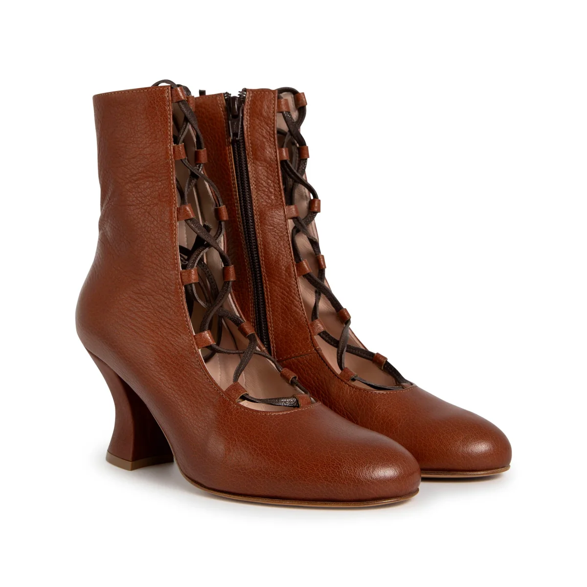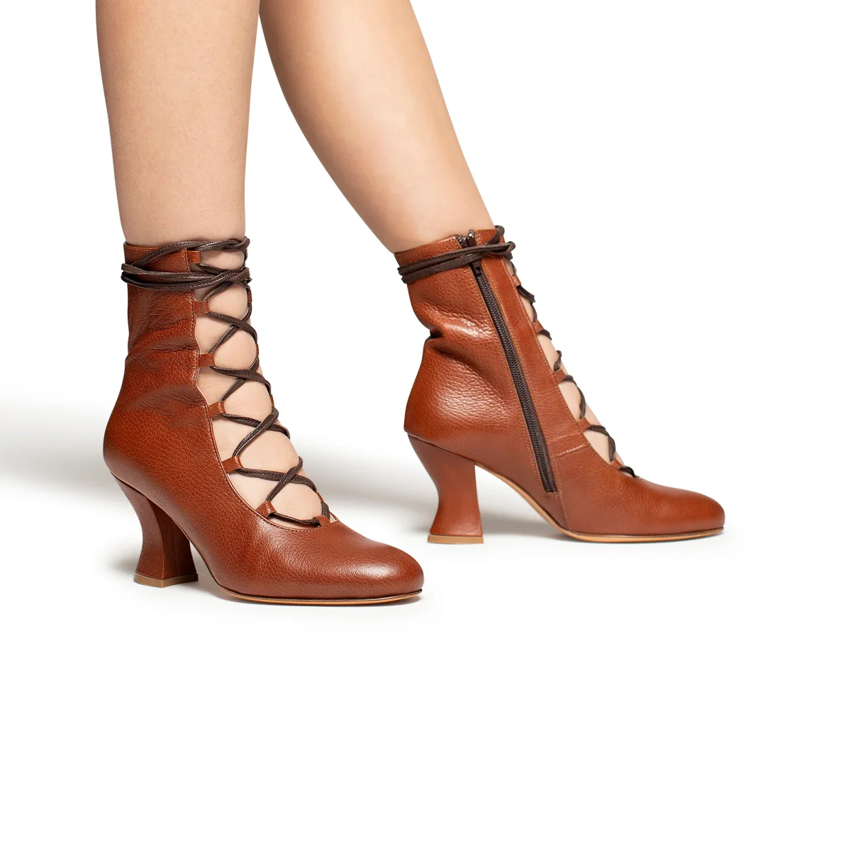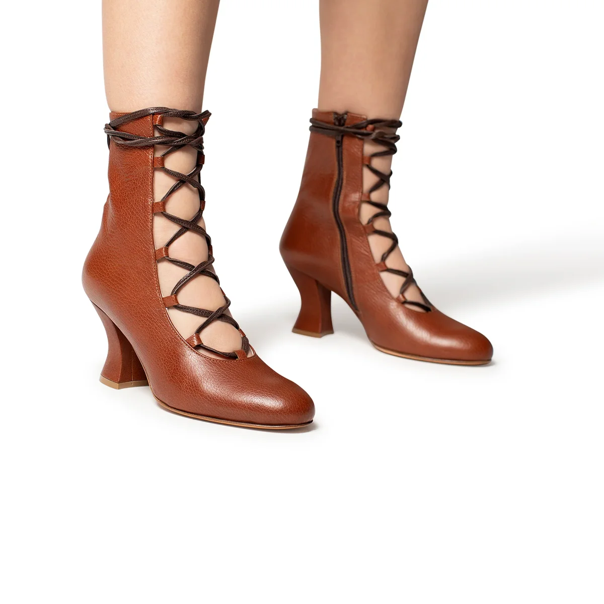 Tronchetto aperto davanti con allacciatura a vista. Tacco 7cm rivestito in pelle. Sottopiede in pelle e fondo in cuoio