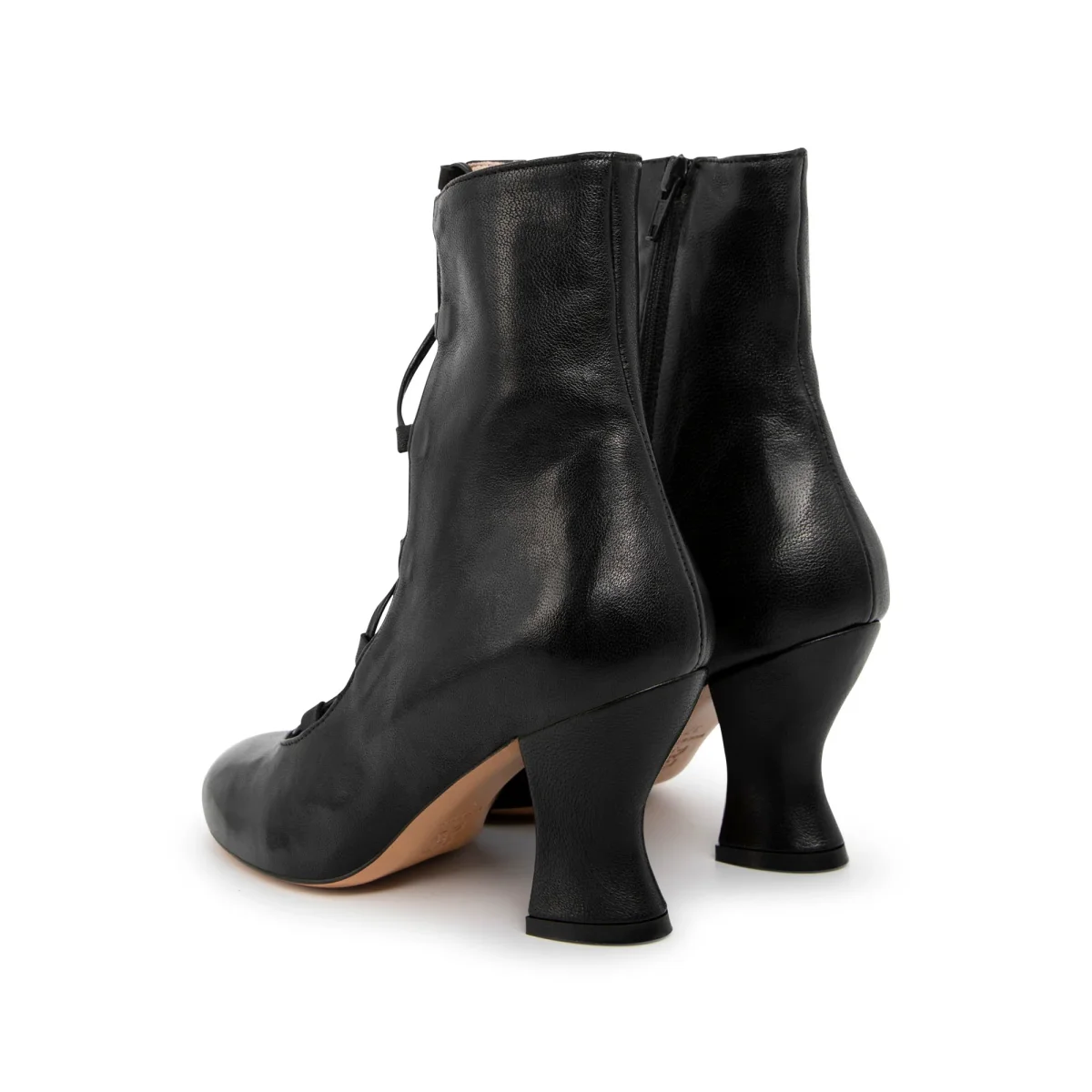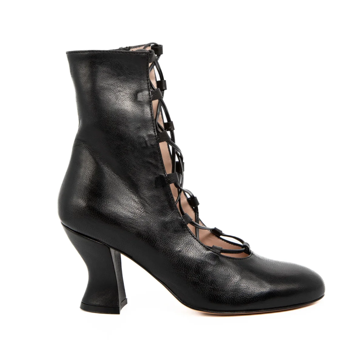 Tronchetto aperto davanti con allacciatura a vista. Tacco 7cm rivestito in pelle. Sottopiede in pelle e fondo in cuoio