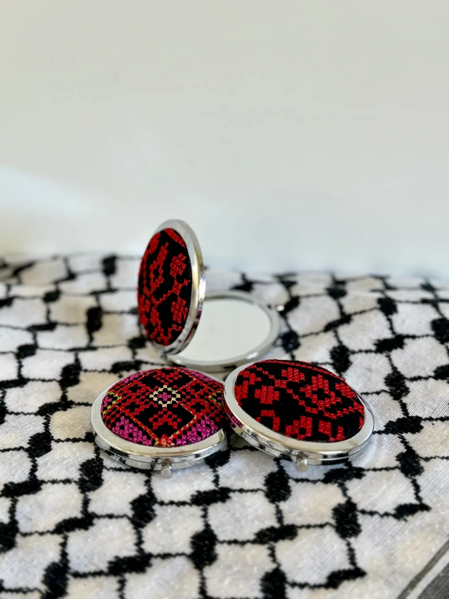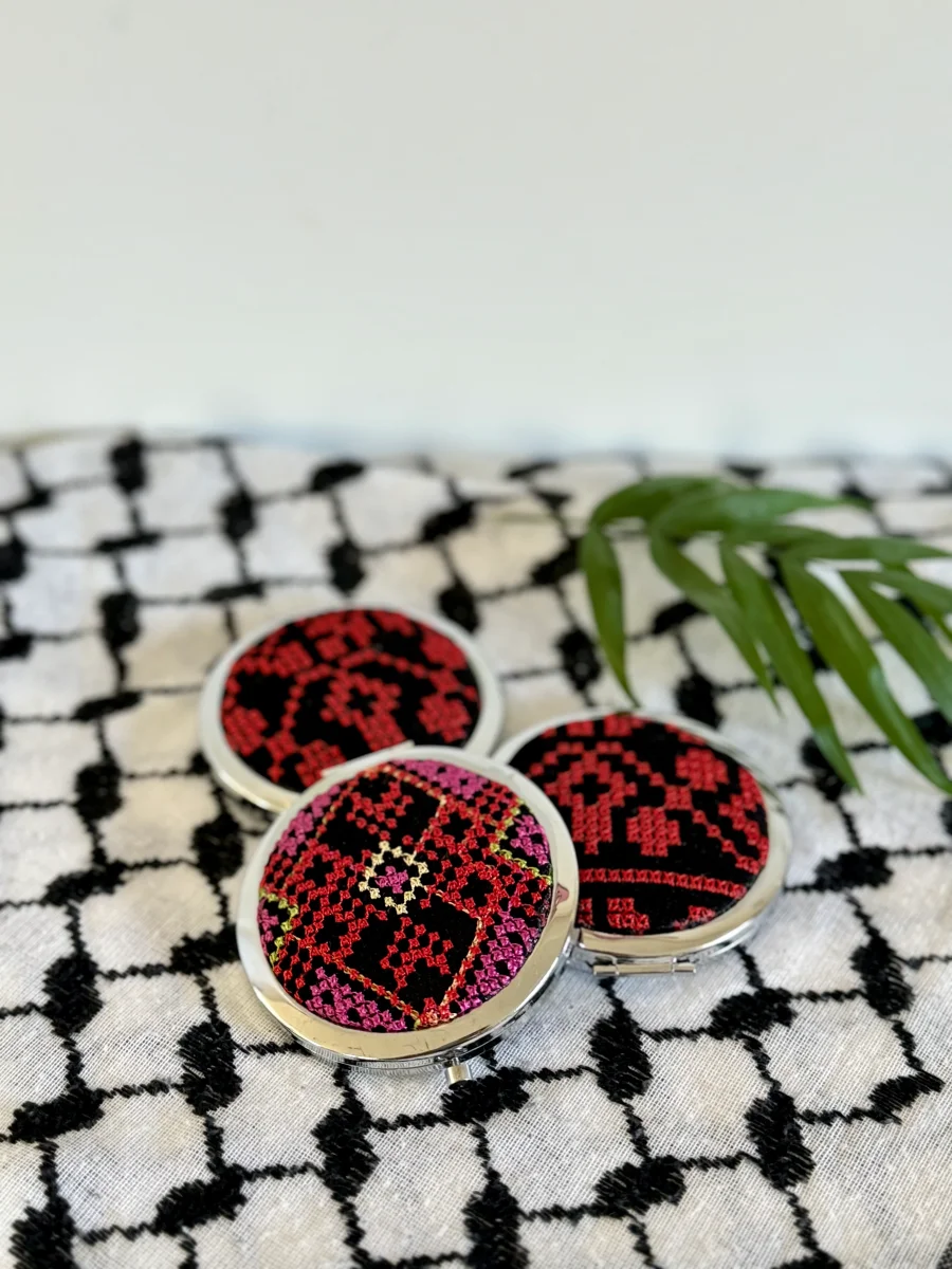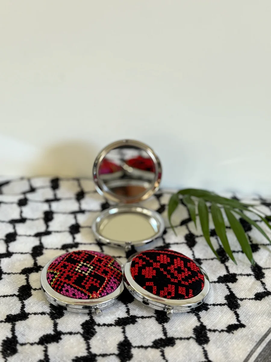 Specchietto tascabile in tessuto tatreez. Ogni pezzo è unico e diverso dall’altro.