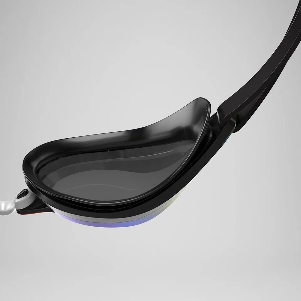 Occhialino Speedo Fastskin Speedsocket 2 Mirror per il nuoto da competizione. E’ dotato di ponte nasale intercambiabile in tre diverse misure per una calzata personalizzata e perfetta. Il doppio laccetto, in silicone con il logo Speedo, offre una presa sicura. Ottimo il fermo che blocca la misura del laccio.
