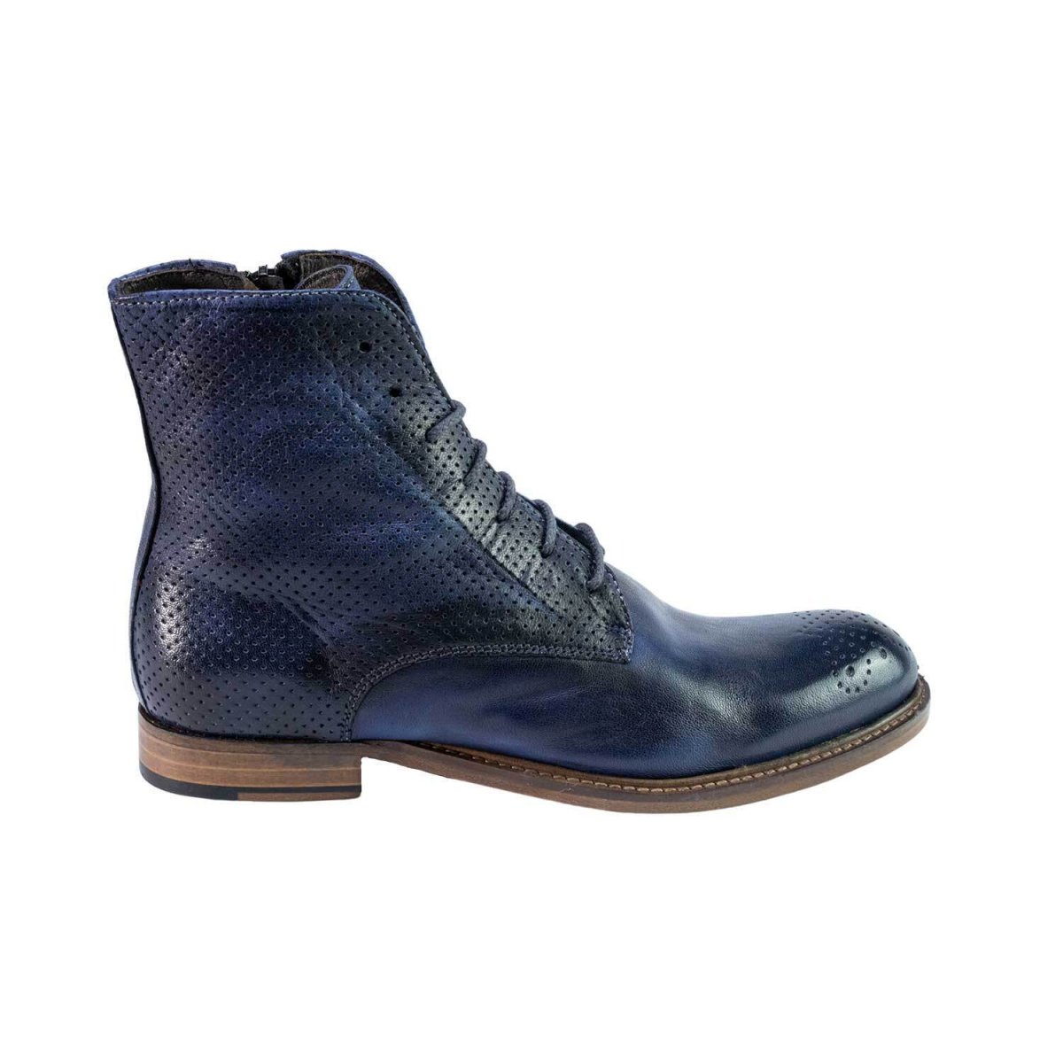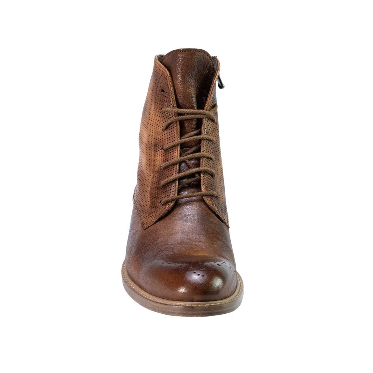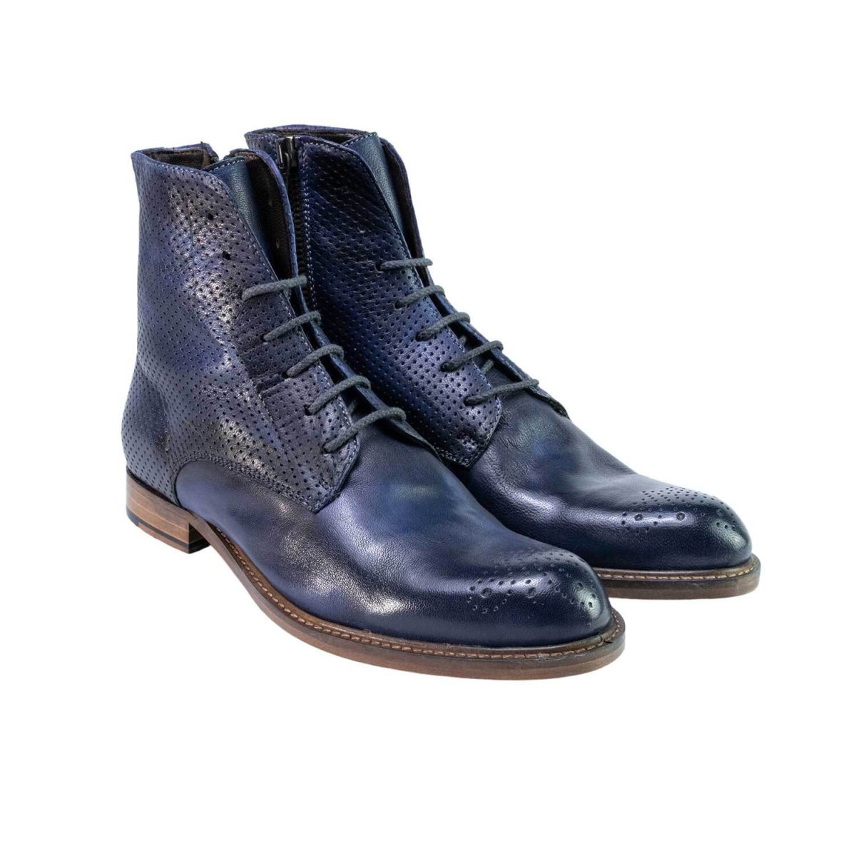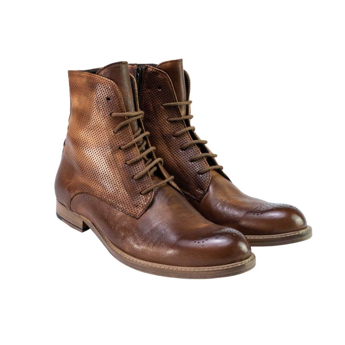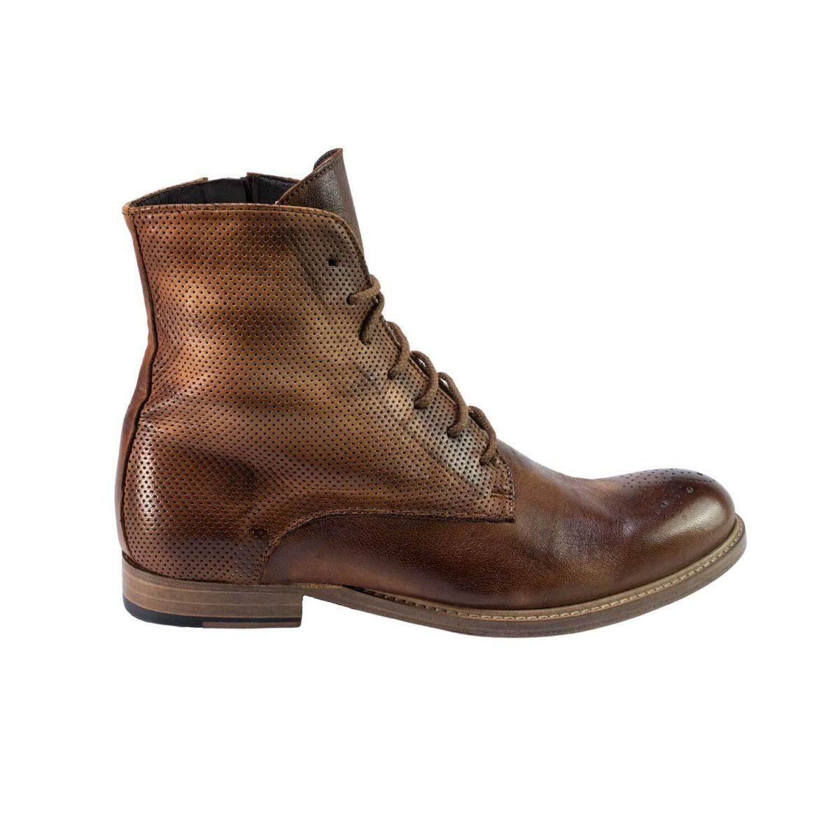 Questo stivaletto viene trattato e colorato artigianalmente, presenta lacci e una zip laterale che, una volta regolate le stringhe, permettono una calzata rapida e comoda. Design forato sulla parte alta della tomaia che è foderata permettendo quindi la praticibilità della calzatura anche durante giornate piovose. Piccola lavorazione in punta. Stile classico ed intramontabile. La suola è interamente in cuoio con un piccolo inserto in gomma sul tacco.