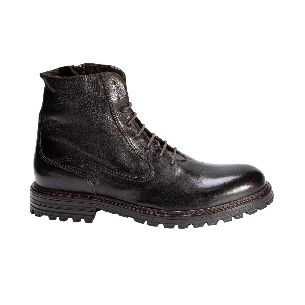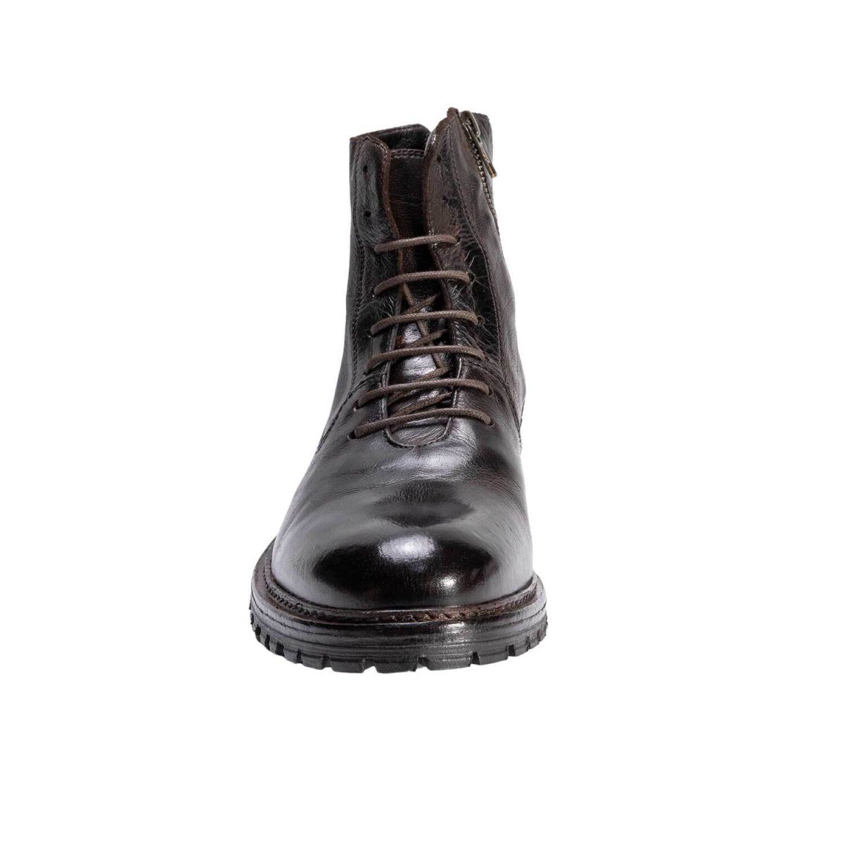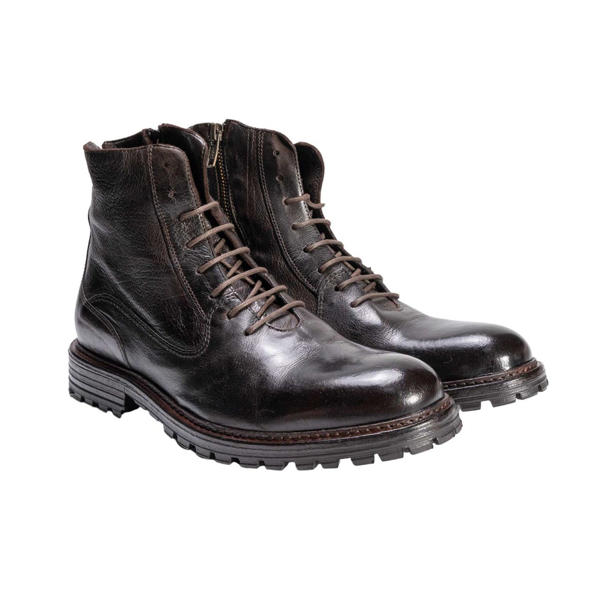 Questo stivaletto allacciato viene interamente prodotto e colorato a mano e presenta una zip laterale che permette una calzata rapida e comoda una volta regolate le stringhe. Suola a carroarmato in gomma che danno un look casual e aggressivo mantenendo comunque eleganza e unicità di genere; data la suola in gomma è perfetto per le stagioni di piogge e freddo.