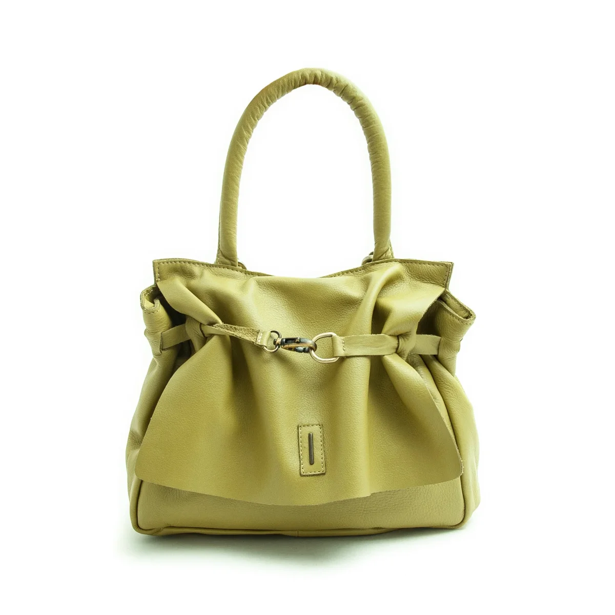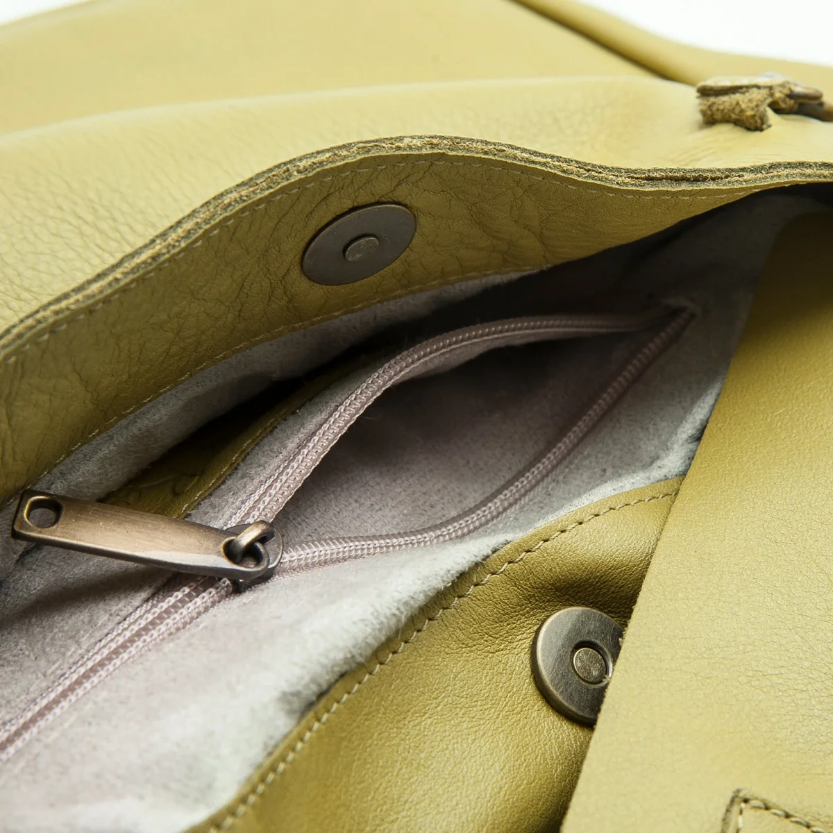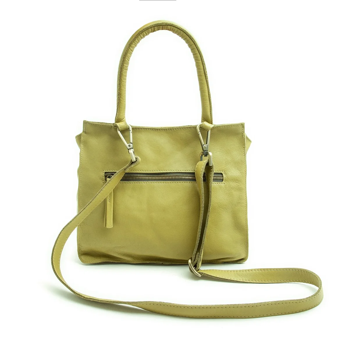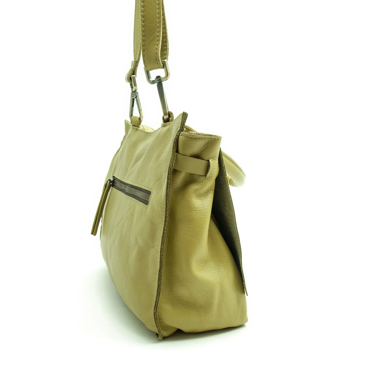 Una zip sul quadrante posteriore che protegge una tasca di servizio oltre ad un’ampia e comoda apertura sotto una morbida patta con chiusura a magnete forte. E all’interno ancora una tasca protetta da zip . La fodera chiara ti permetterà di vedere con facilità il suo contenuto. Il manico tubolare imbottito e la tracolla è regolabile e rimovibile. Gli elementi in metallo sono tutti in ottone spazzolato .