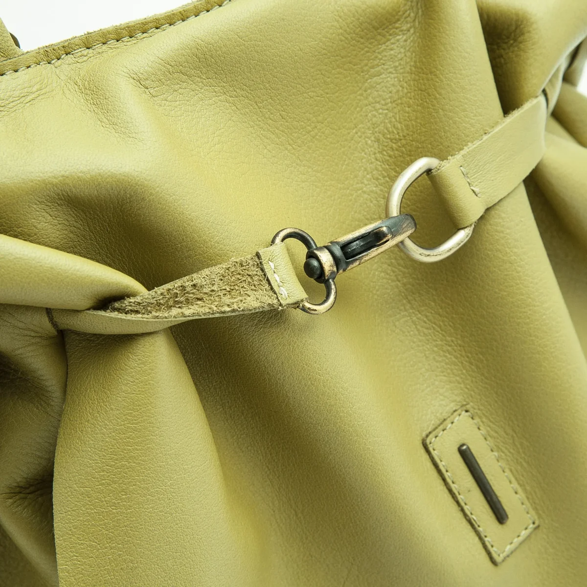 Suè è mignon ma capiente con la sua patta può essere libera effetto postina o trattenuta dal motivo in pelle e moschettone che l’arriccia vezzosamente.
