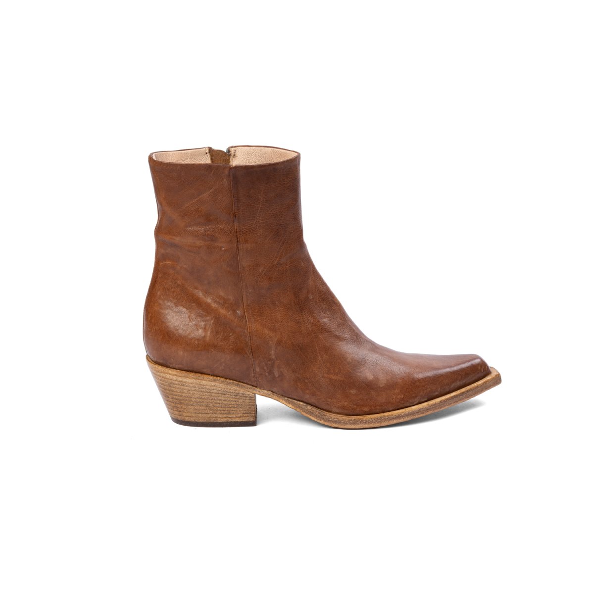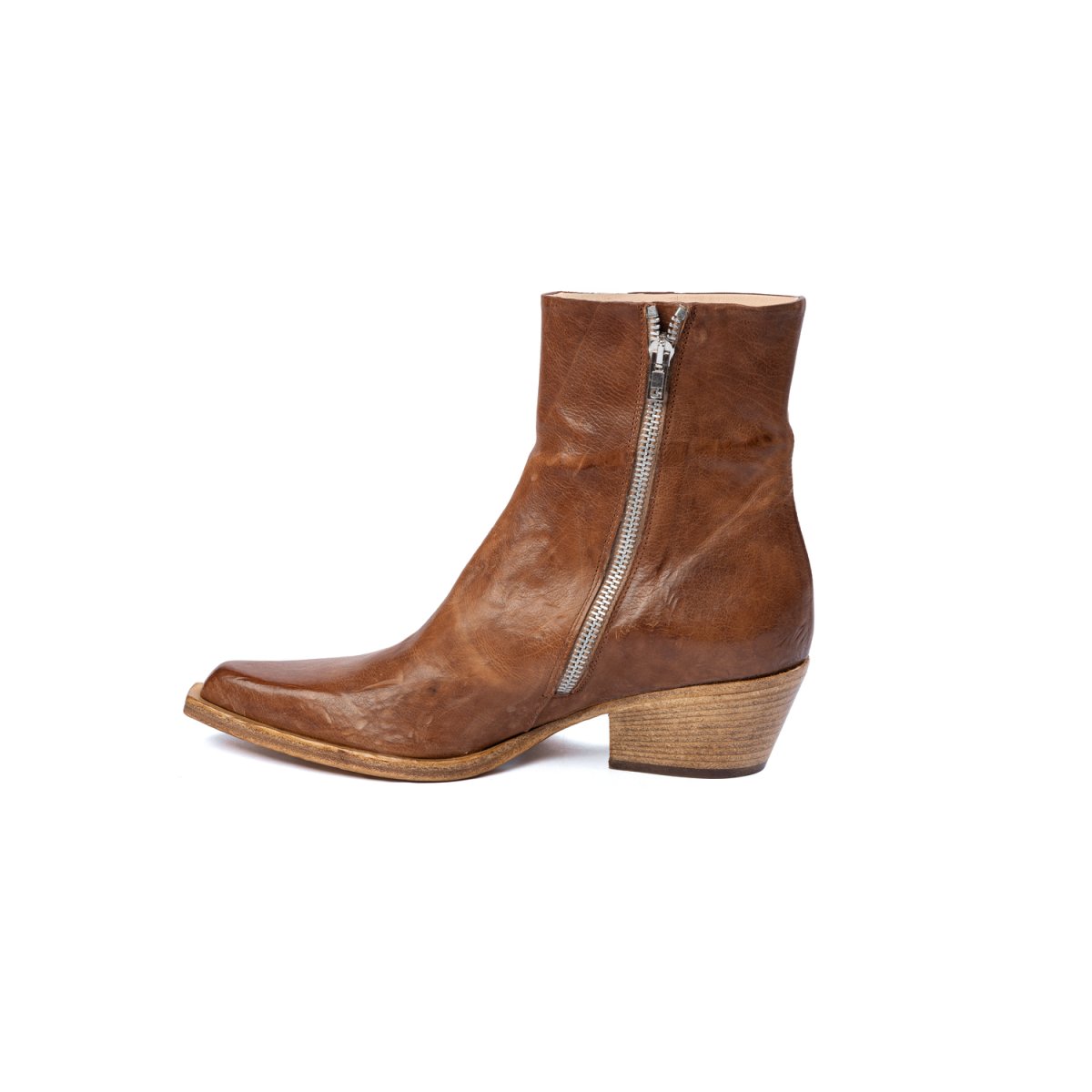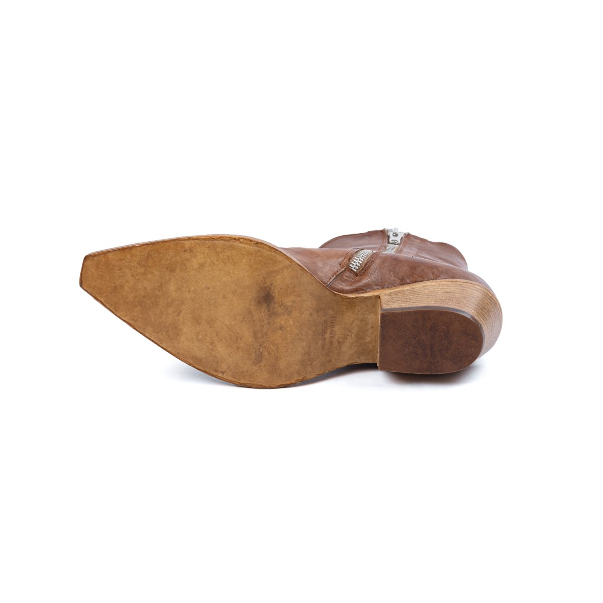 Cod. Fornitore: 8296 cod. art. 000754 Texano da donna in pelle di vitellino invecchiata, trattata e colorata artigianalmente. Stivaletto texano classico e stiloso da abbinare con jeans o gonna. Presenta una zip laterale che aiuta la calzata. La suola è interamente in cuoio. Disponibile nelle varianti cuoio e avana.