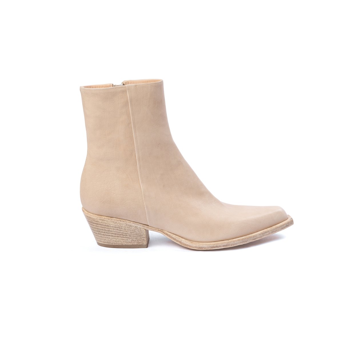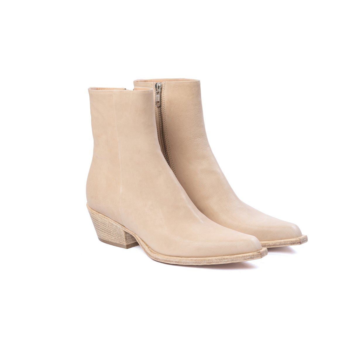 Texano da donna in pelle di vitellino invecchiata, trattata e colorata artigianalmente. Stivaletto texano classico e stiloso da abbinare con jeans o gonna. Presenta una zip laterale che aiuta la calzata. La suola è interamente in cuoio.