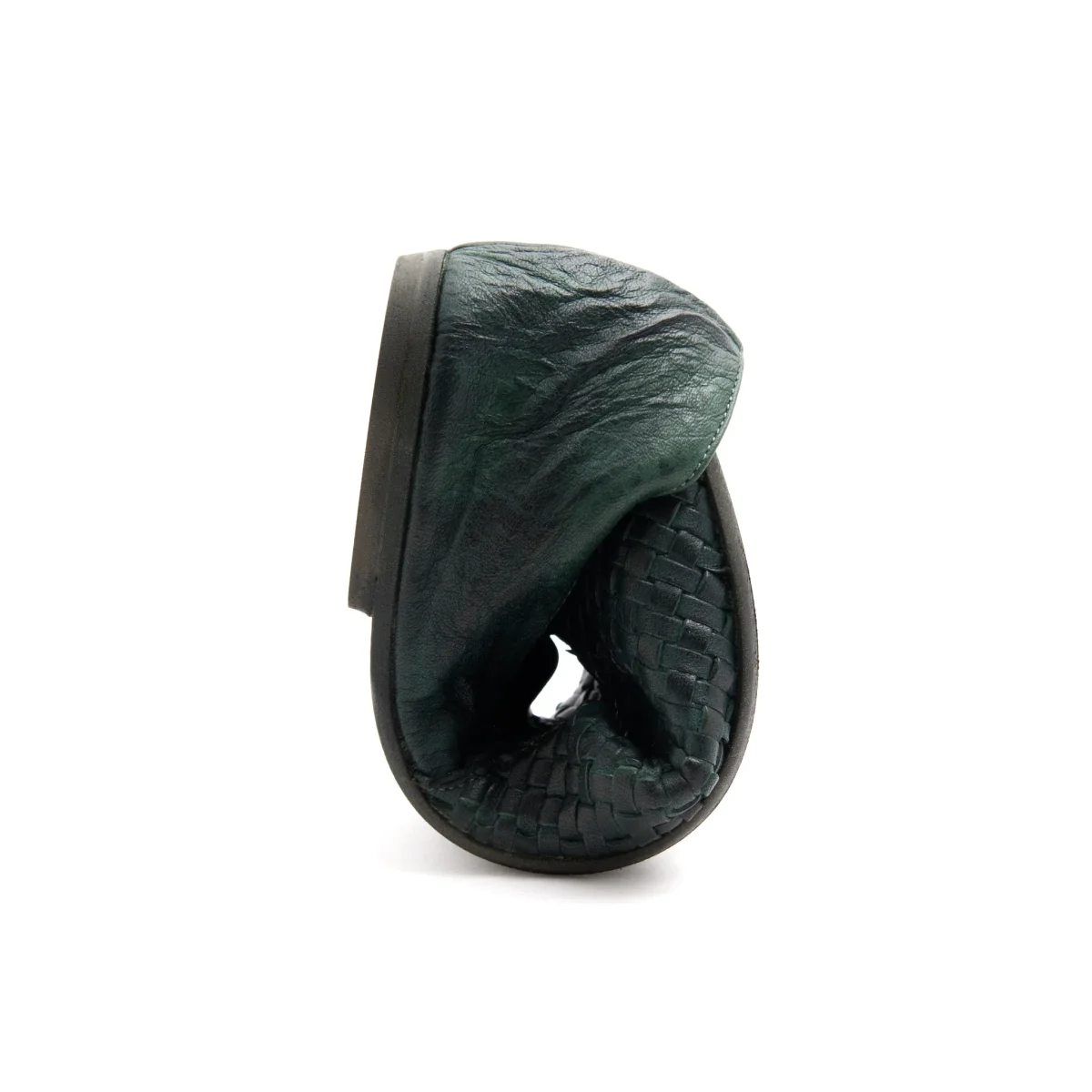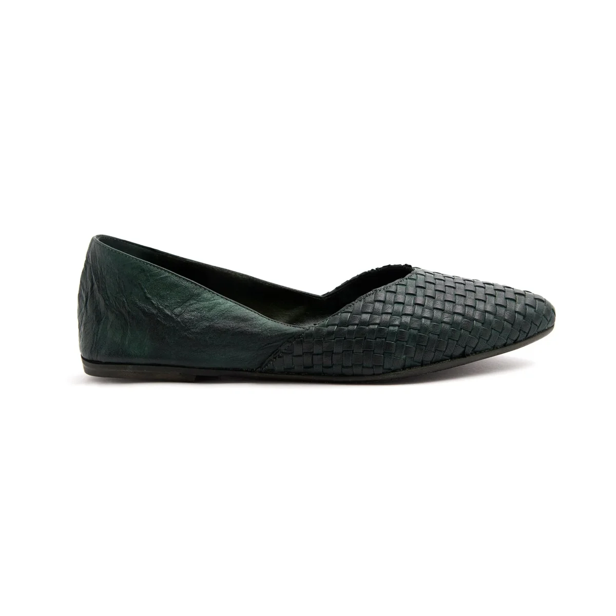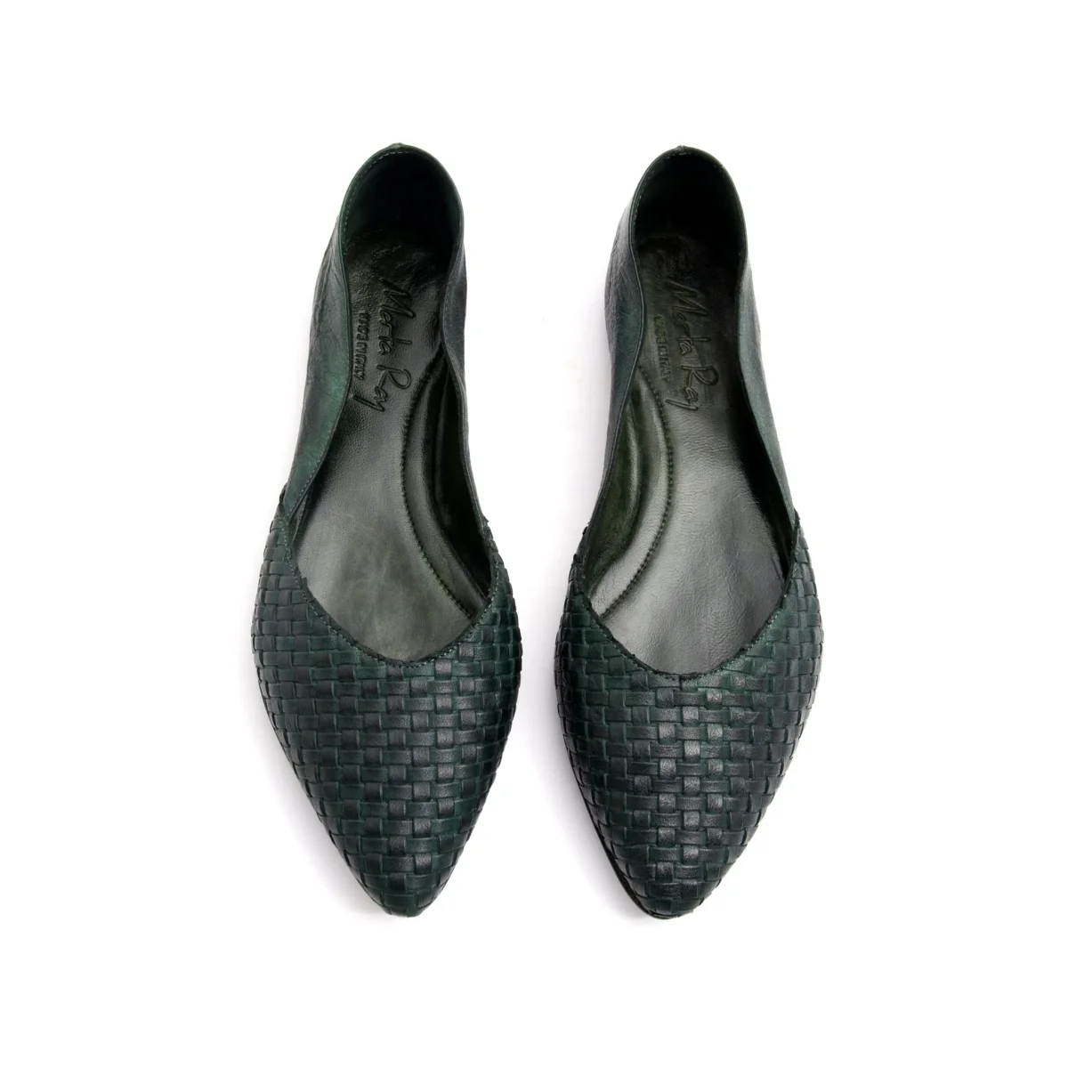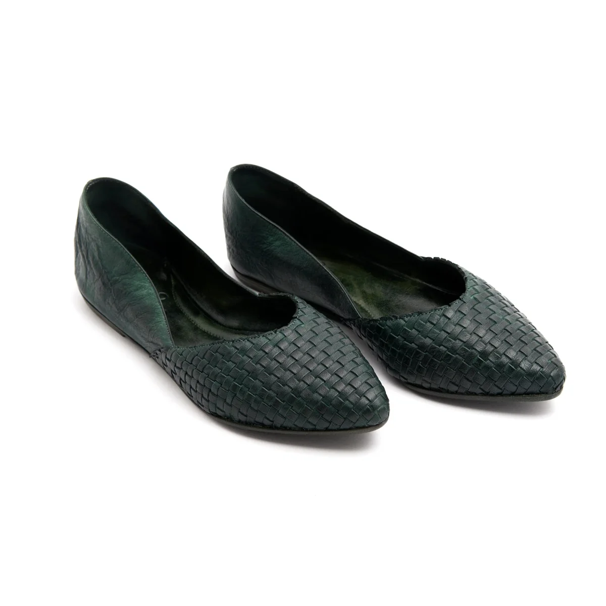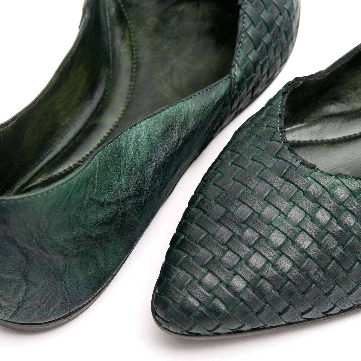 Ballerina a punta impreziosita dall’intreccio a stuoia completamente tinta a mano. Questa lavorazione viene effettuata con antichi metodi artigianali, solo in questo modo ogni scarpa assume delle sfumature uniche.