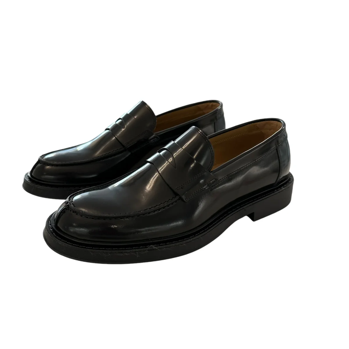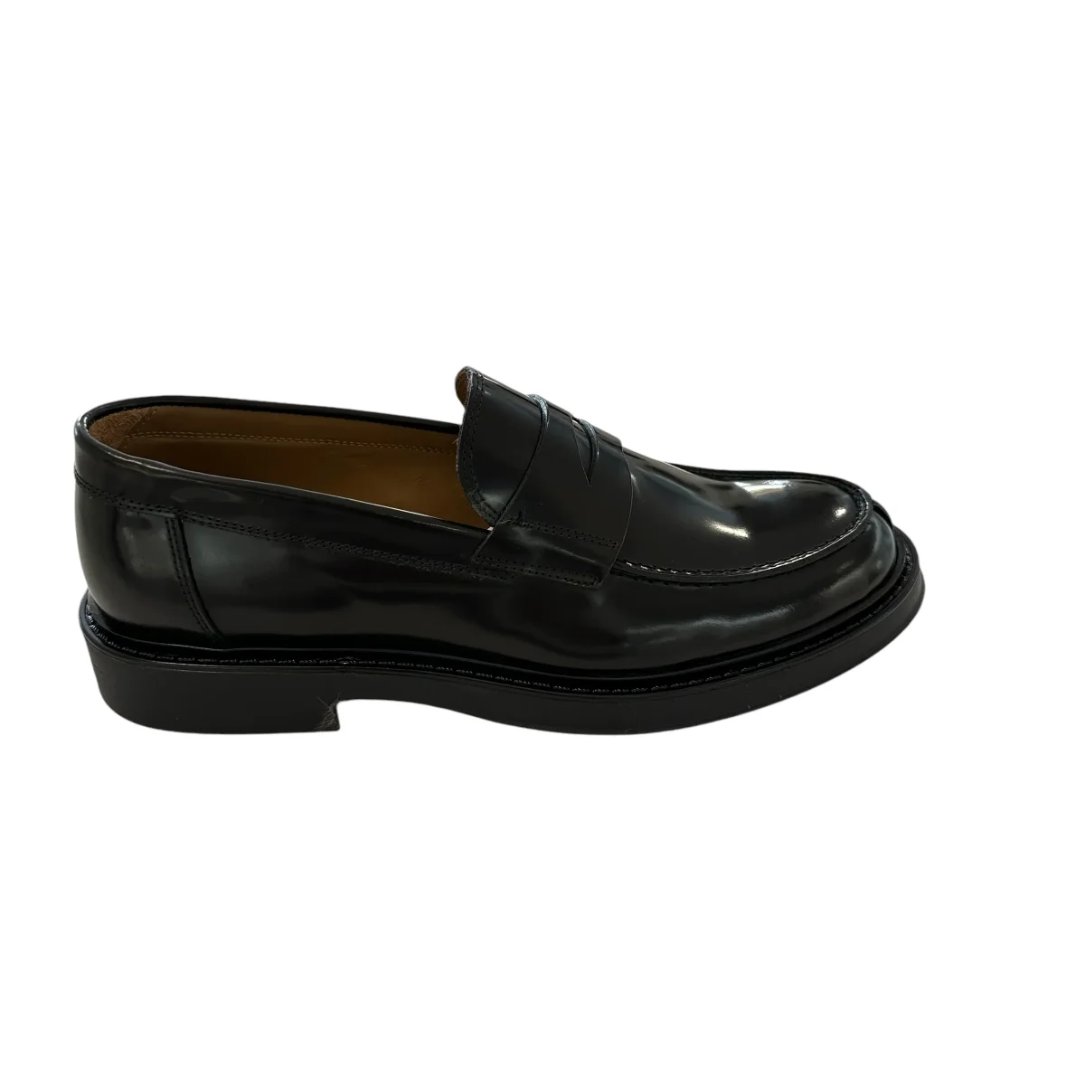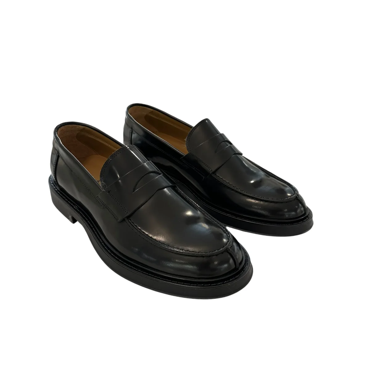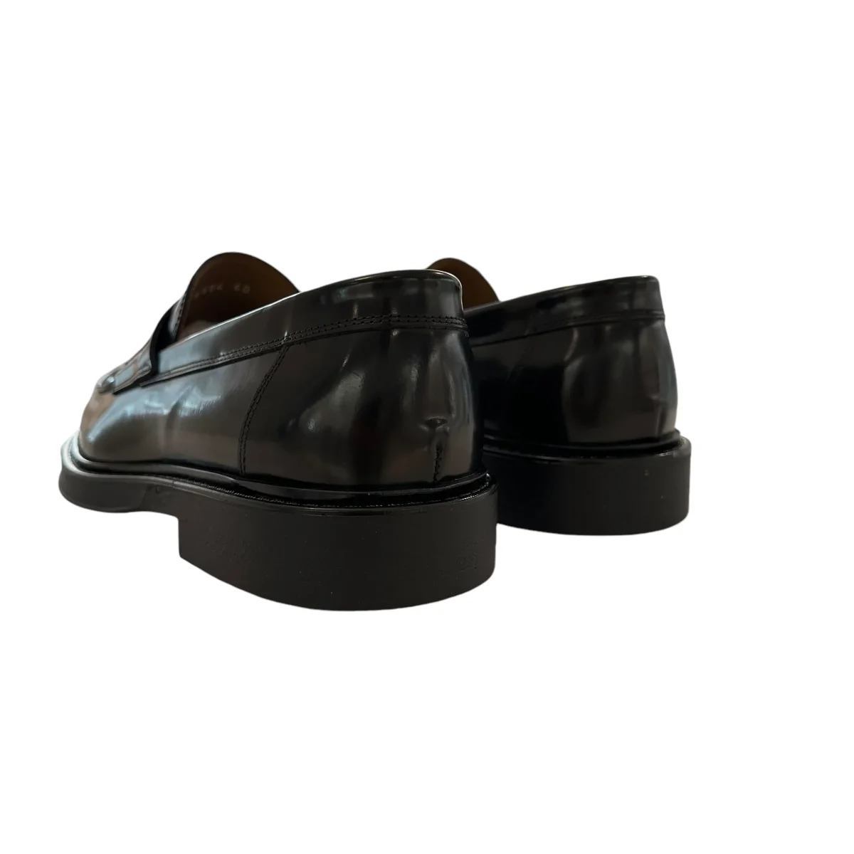 La tomaia è realizzata in vera pelle spazzolata o lucida in un nero profondo, che conferisce alla scarpa una finitura elegante e formale, perfetta per gli ambienti professionali o per le serate speciali. La classica mascherina Penny mantiene l’aspetto iconico e versatile del modello.