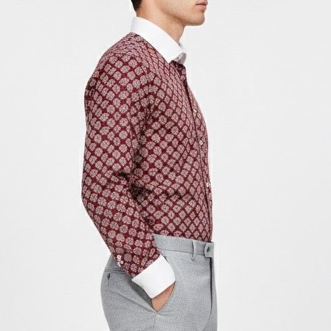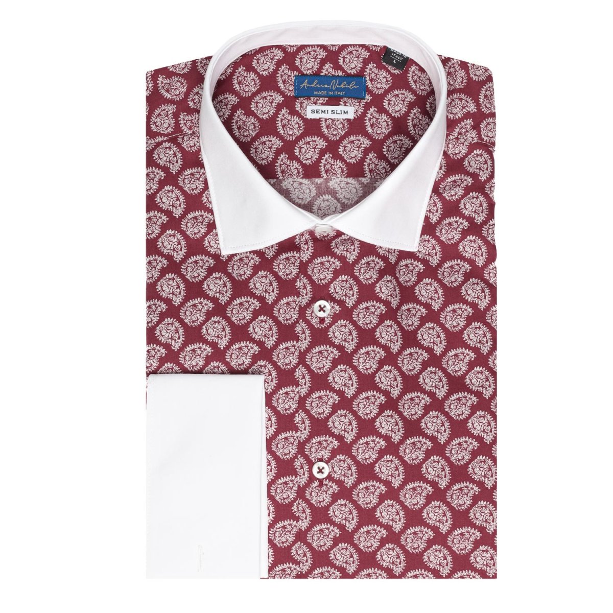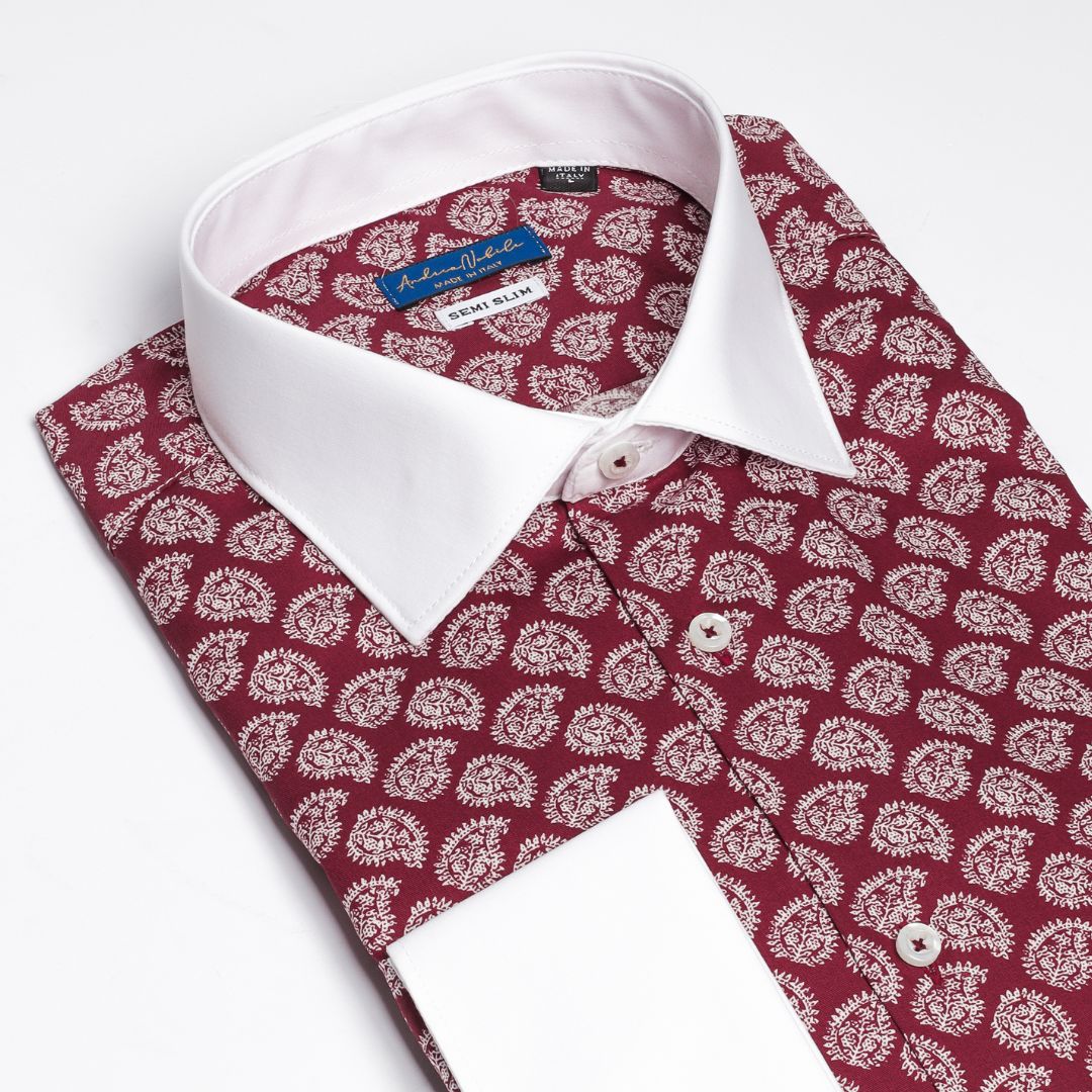 Camicia Made in Italy, resa particolare dalla fantasia tribale nel colore bianco su base bordeaux. Collo e polsi gemelli nel colore bianco ispirata allo stile financial businessman tipico dei personaggi di Wall Street. Modello semi-slim con pinces sul retro della camicia per una vestibilità perfetta. Bottoni perlati con cucitura a croce in cotone a contrasto. Camicia dallo stile unico, espressione d’eccellenza nella ricerca di forme, nell’accuratezza delle lavorazioni, nell’esclusività dei dettagli.