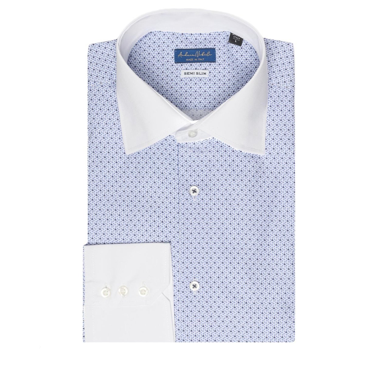 Camicia Made in Italy, resa particolare dalla fantasia geometrica nel colore azzurro e blu su base bianca.