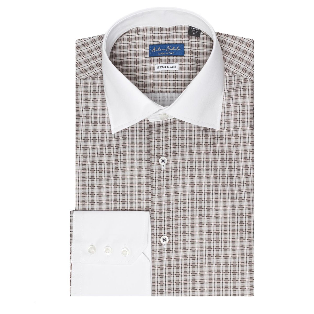 Camicia Made in Italy, resa particolare dalla fantasia geometrica nel colore marrone e grigio su base beige. Il collo è di colore bianco, mentre i polsini, anch’essi bianchi, sono con angoli squadrati e tre bottoni, ispirati allo stile financial businessman tipico dei personaggi di Wall Street. Modello semi-slim con pinces sul retro della camicia per una vestibilità perfetta. Bottoni perlati con cucitura a croce in cotone a contrasto. Camicia dallo stile unico, espressione d’eccellenza nella ricerca di forme, nell’accuratezza delle lavorazioni, nell’esclusività dei dettagli.