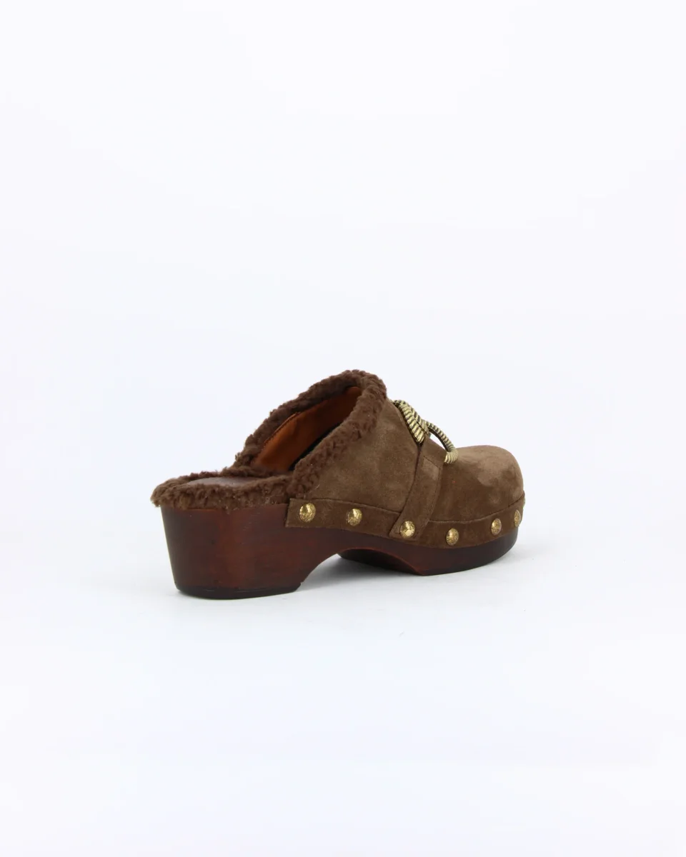 ZEBRA Zoccolo in camoscio con suola effetto legno e soletta imbottita. Zebra è uno zoccolo in camoscio a forma di sabot con borchie in metallo, la soletta è comoda ed imbottita. La suola effetto legno è alta 5 cm ed il plateau è di 2 cm.