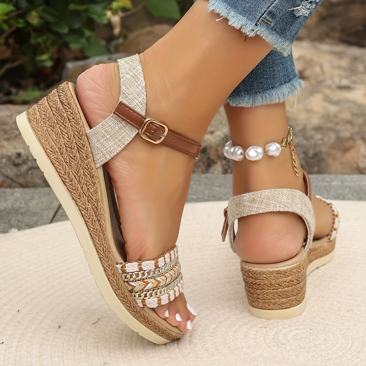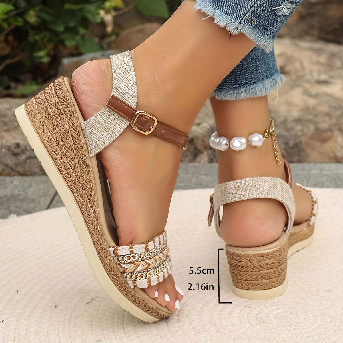 Zeppe estive alte 5,5 cm , con punta aperta e cinturino alla caviglia, impreziosite da applicazioni brillanti che donano un tocco luminoso al look. Il tacco medio, la chiusura con fibbia e la suola leggera in materiale tecnico offrono una calzata comoda e stabile. Perfette per la primavera e l’estate, da abbinare a outfit casual o più curati.