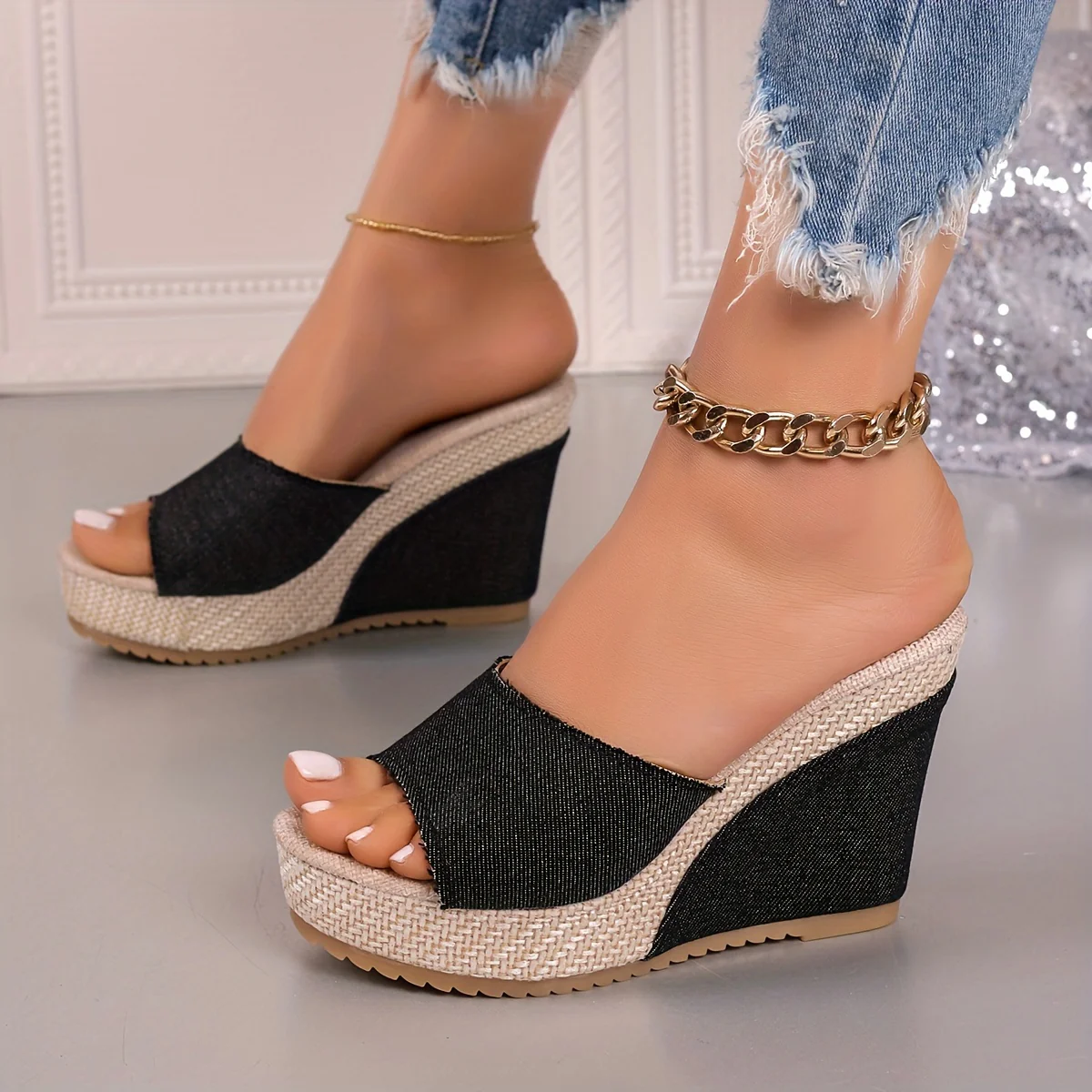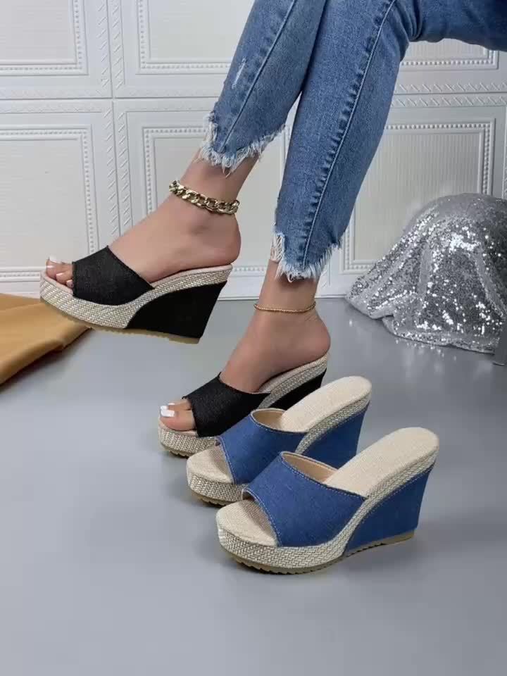 Zeppe estive in tessuto denim con punta aperta e design slip-on, perfette per uno stile casual e rilassato. La fascia posteriore garantisce stabilità, mentre la suola flessibile in gomma tecnica e il plantare in tessuto assicurano comfort per tutto il giorno. Un modello versatile, ideale per la primavera e le giornate all’aperto.