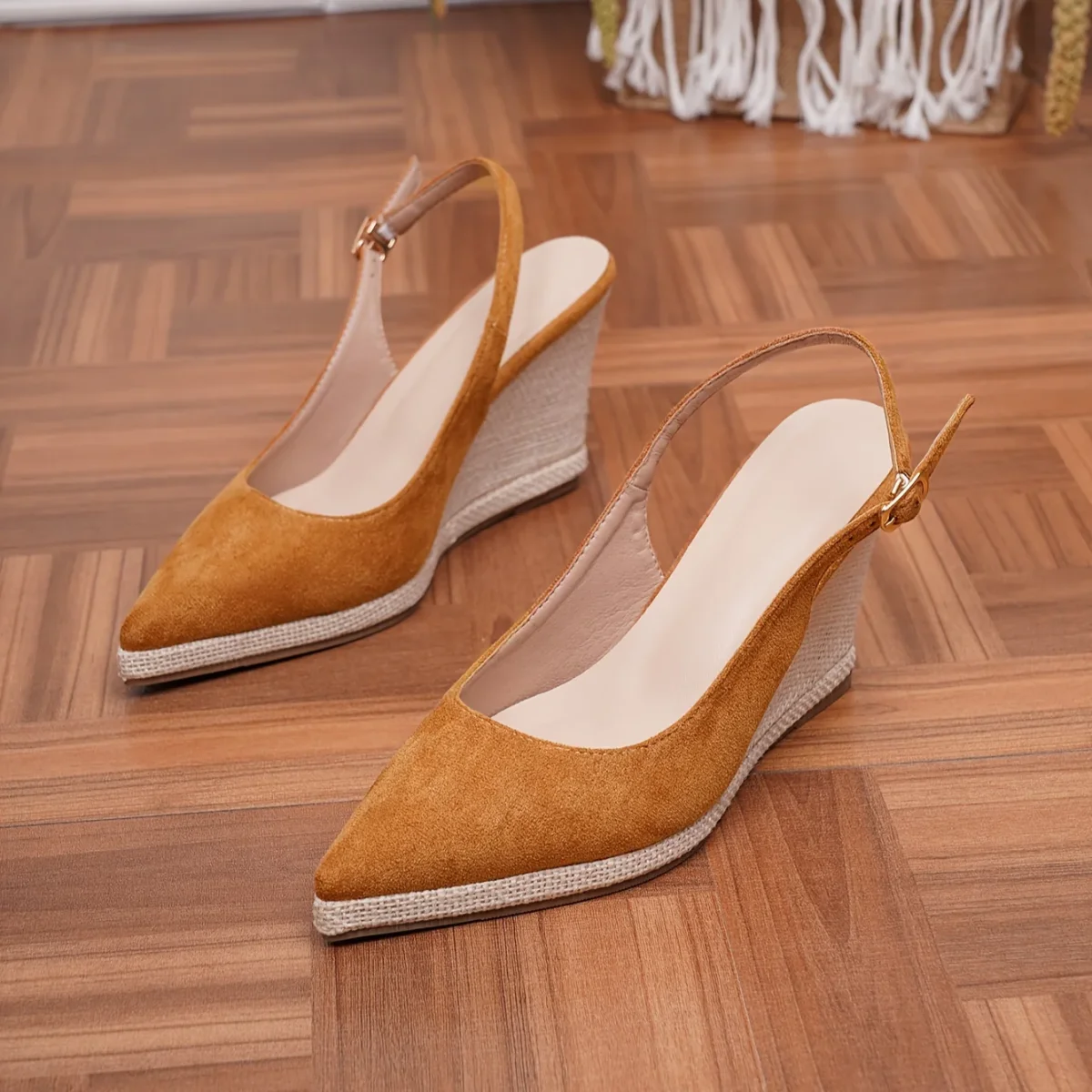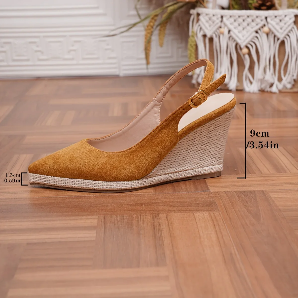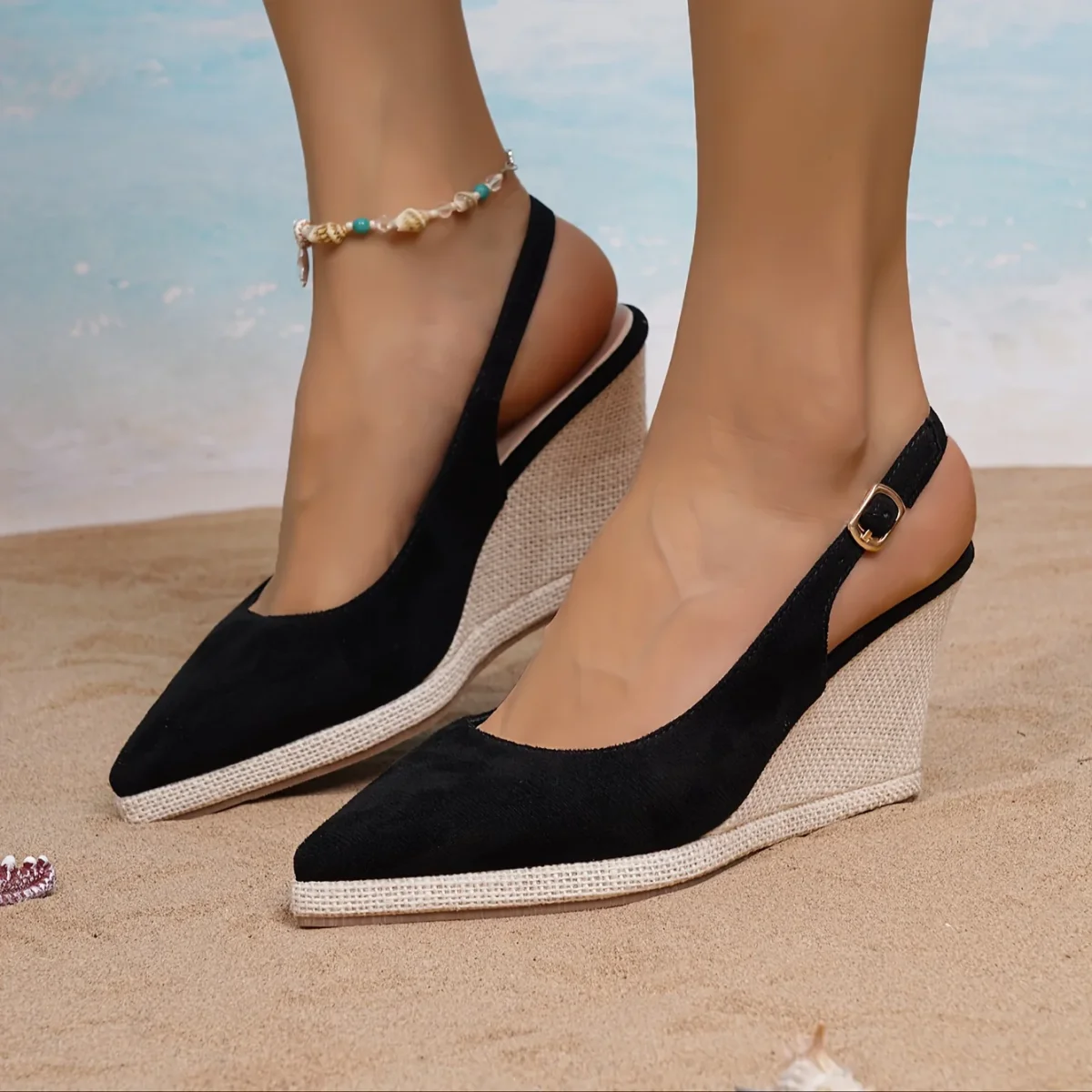 Zeppa alta 9 cm, punta affusolata e cinturino slingback con chiusura a strappo. Realizzati in tessuto leggero e suola in TPR, offrono un look slanciato e moderno senza rinunciare alla comodità della piattaforma. Perfetti per uscite estive e abbinamenti casual chic.