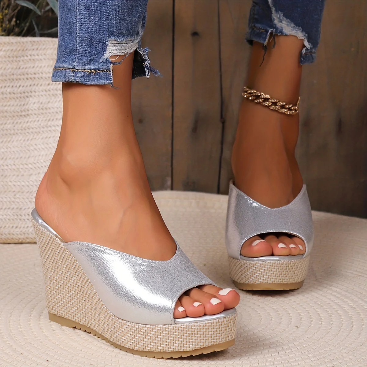 Zeppe slip-on da indossare facilmente, alte circa 11 cm con punta aperta e cinturino alla caviglia per una maggiore stabilità. Realizzate in tessuto leggero con interno in materiale sintetico, abbinate a una suola flessibile in gomma tecnica che assicura comfort anche nelle giornate più calde. Uno stile semplice e versatile, perfetto per look estivi casual o vacanzieri.