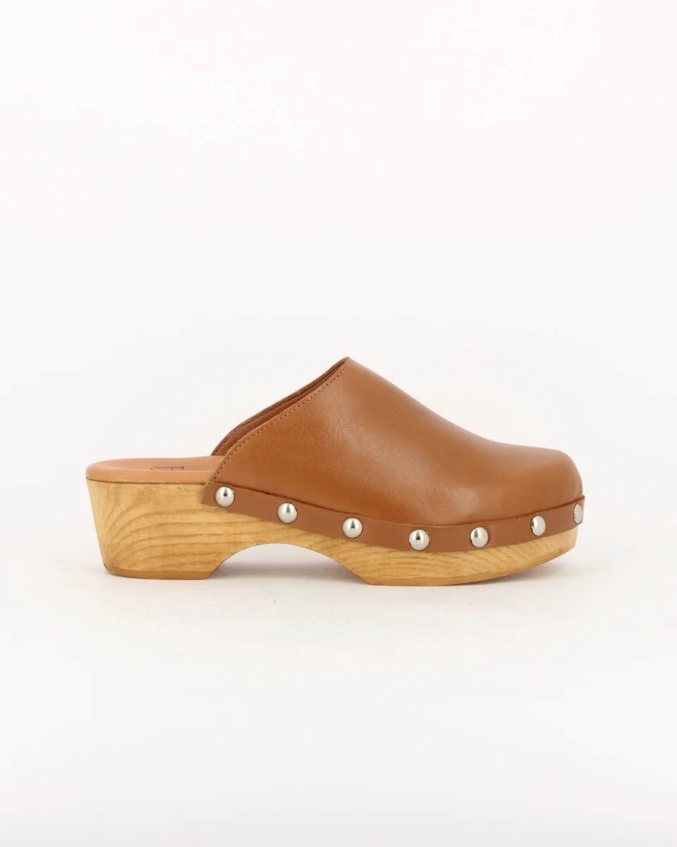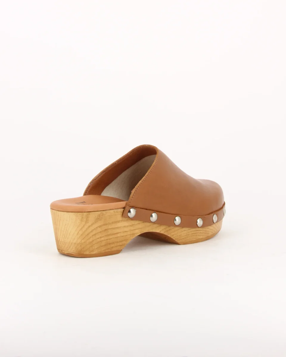 ZEUS Zoccolo in pelle scamosciata con suola effetto legno e soletta imbottita. ZEUS è uno zoccolo in pelle scamosciata a forma di sabot con borchie in metallo, la soletta è comoda ed imbottita. La suola effetto legno è alta 5 cm ed il plateau è di 2 cm.