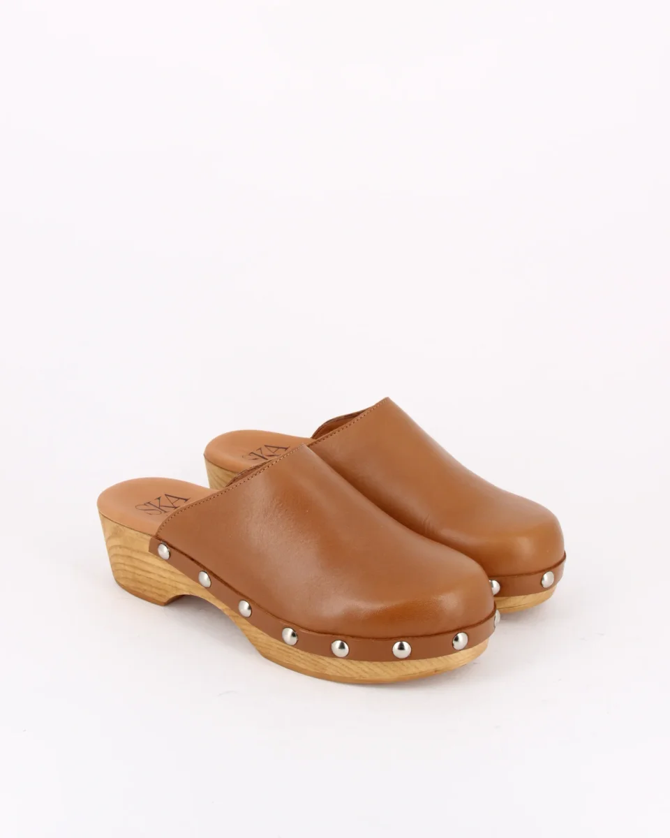 ZEUS è uno zoccolo in pelle scamosciata a forma di sabot con borchie in metallo, la soletta è comoda ed imbottita. La suola effetto legno è alta 5 cm ed il plateau è di 2 cm.