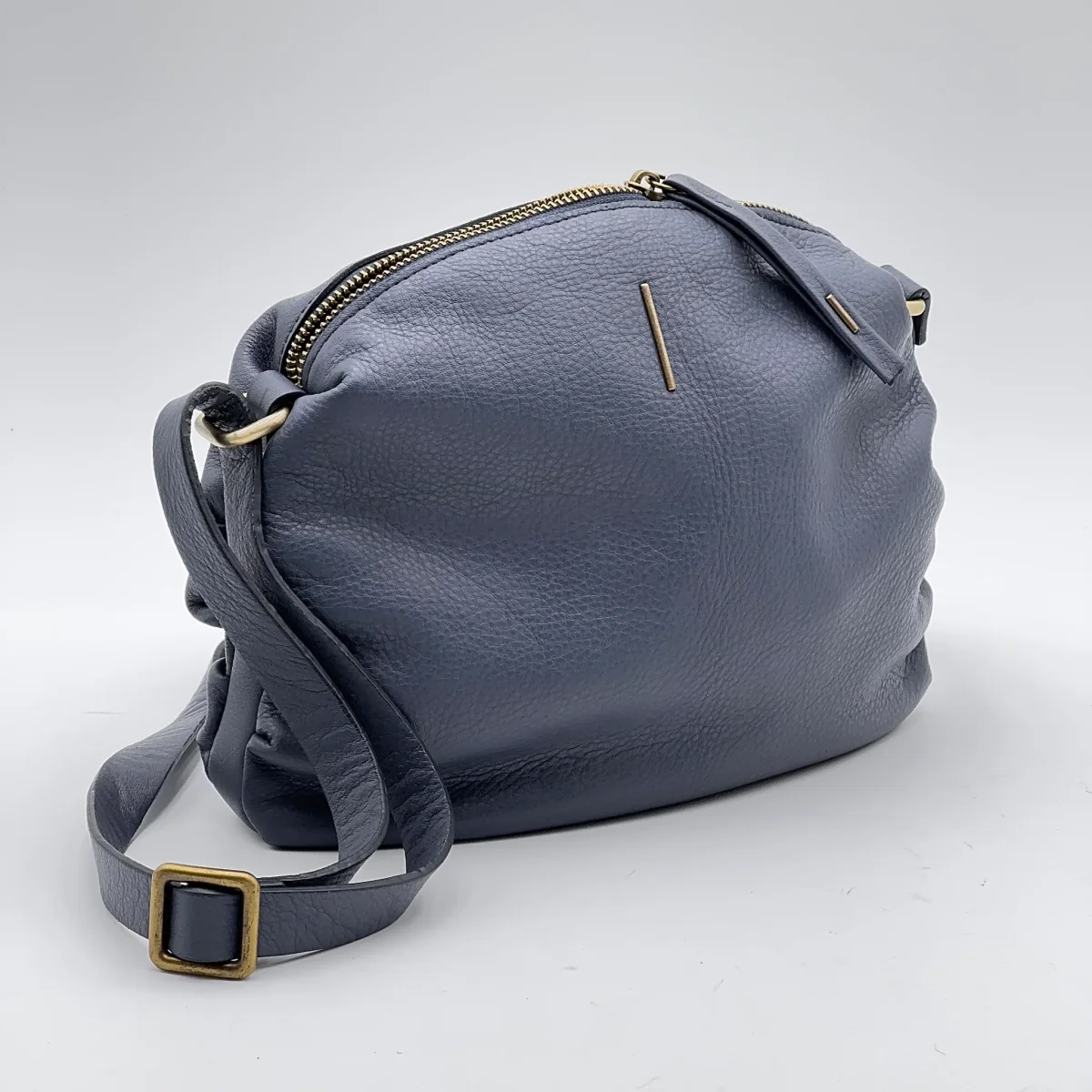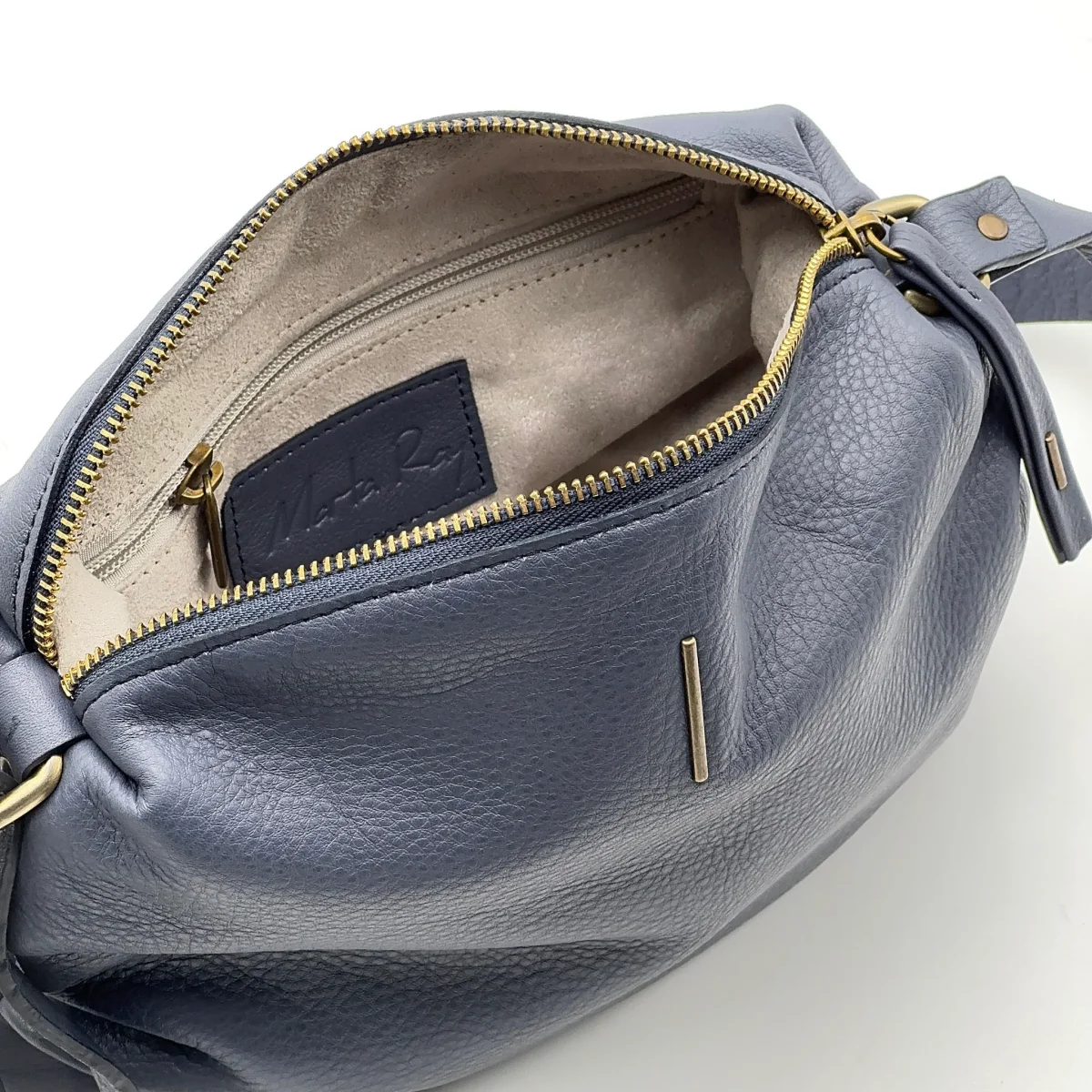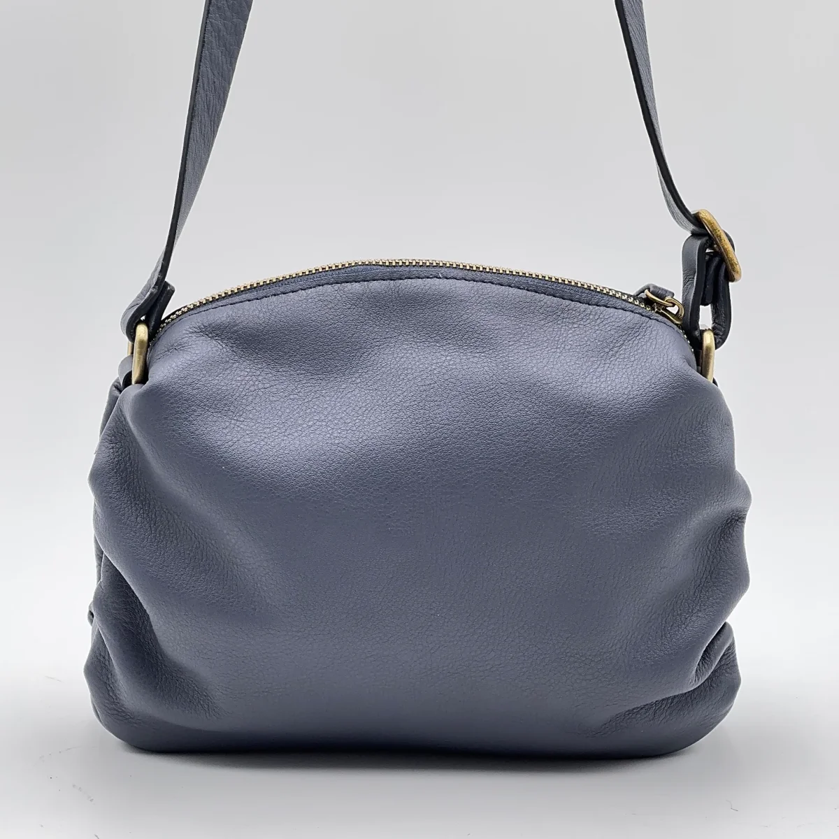 Borsa piccola ma capiente in pelle pieno fiore Mousse color blue jeans, con pieghe a soffietto che le donano una forma a palloncino.Chiusura con zip in ottone, tracolla regolabile per uso a spalla o crossbody. Tasca interna con zip, fodera in microfibra. Dimensioni: Lunghezza 29cm, Altezza 24cm, Profondità 12cm, Tracolla regolabile 126cm