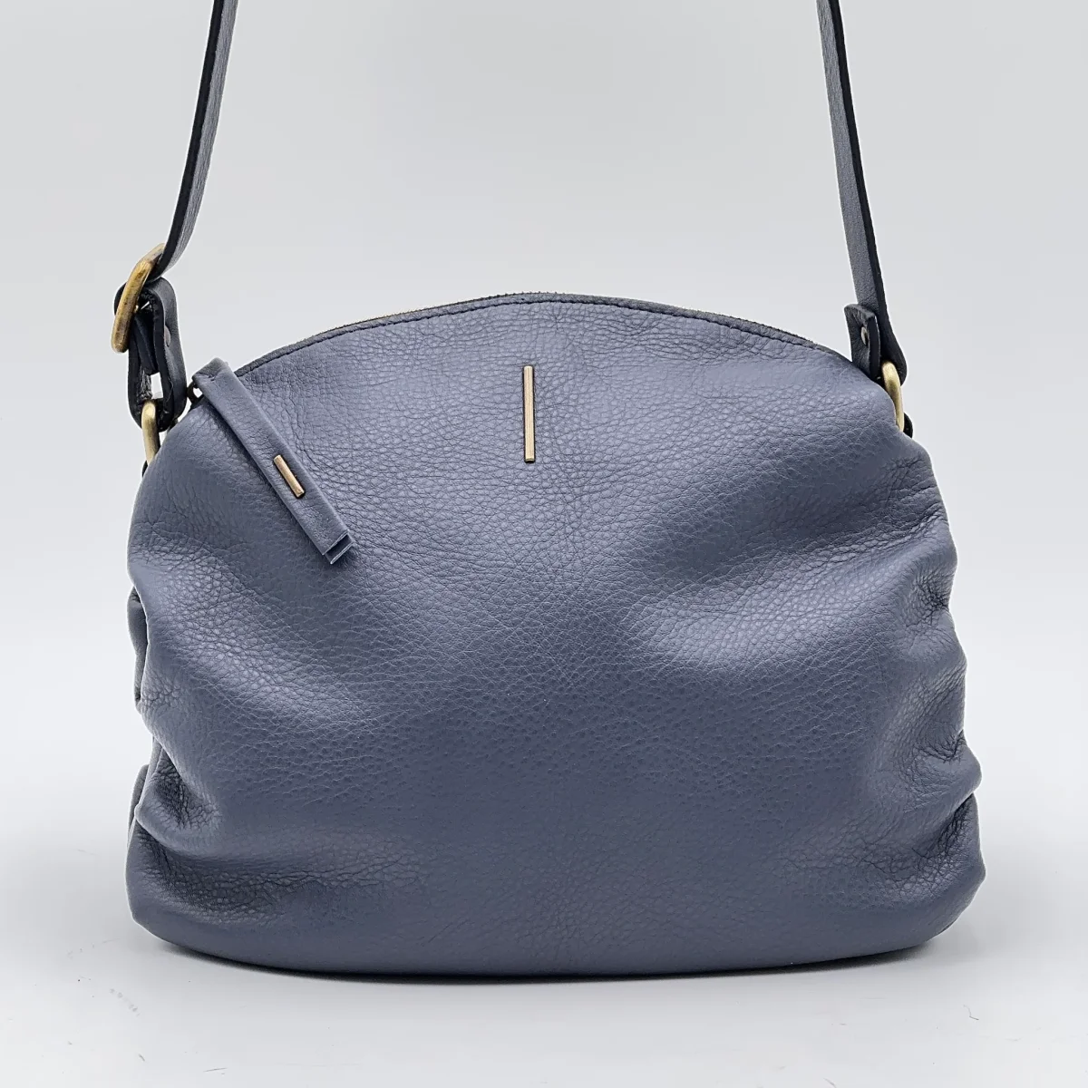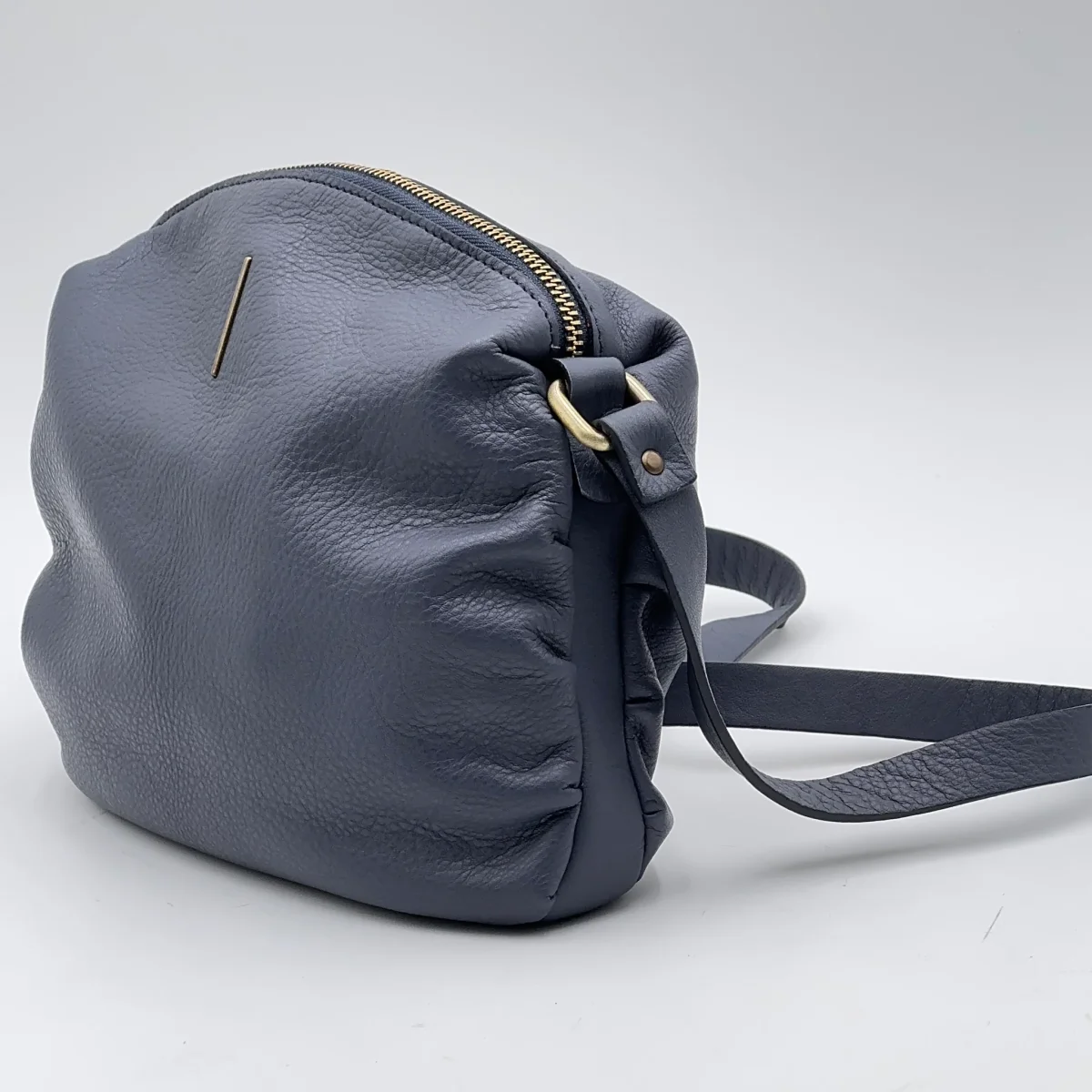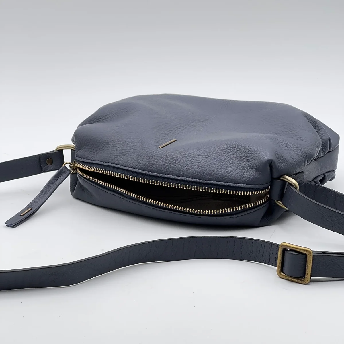 Borsa piccola ma capiente in pelle pieno fiore Mousse color blue jeans, con pieghe a soffietto che le donano una forma a palloncino.Chiusura con zip in ottone, tracolla regolabile per uso a spalla o crossbody. Tasca interna con zip, fodera in microfibra. Dimensioni: Lunghezza 29cm, Altezza 24cm, Profondità 12cm, Tracolla regolabile 126cm