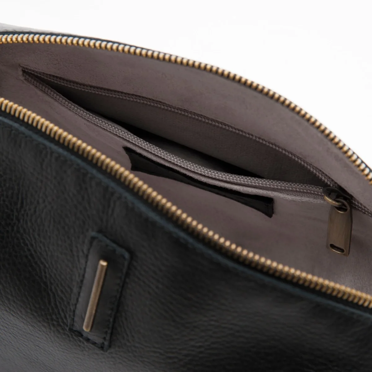 Chiusa da zip in ottone con tasca interna con zip é foderata in micro fibra.